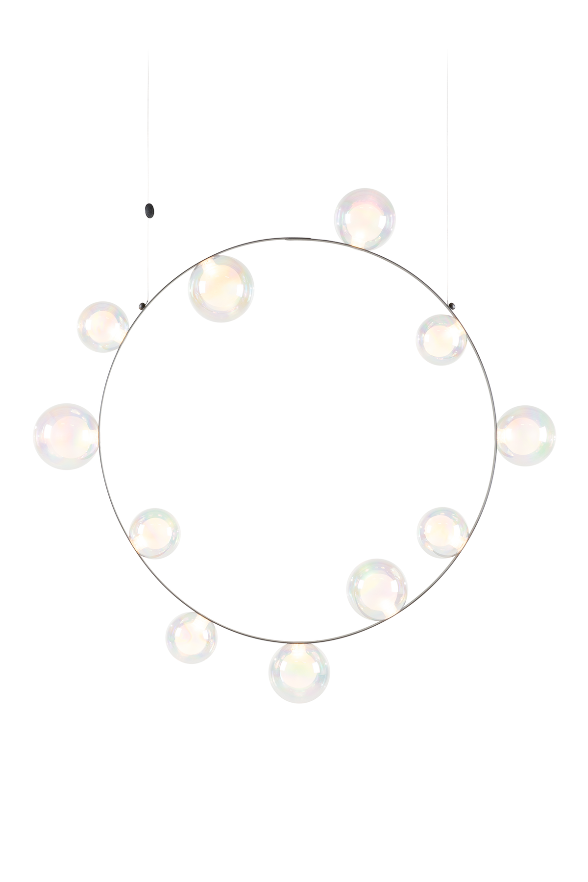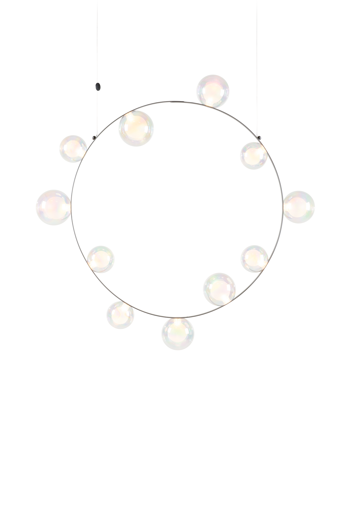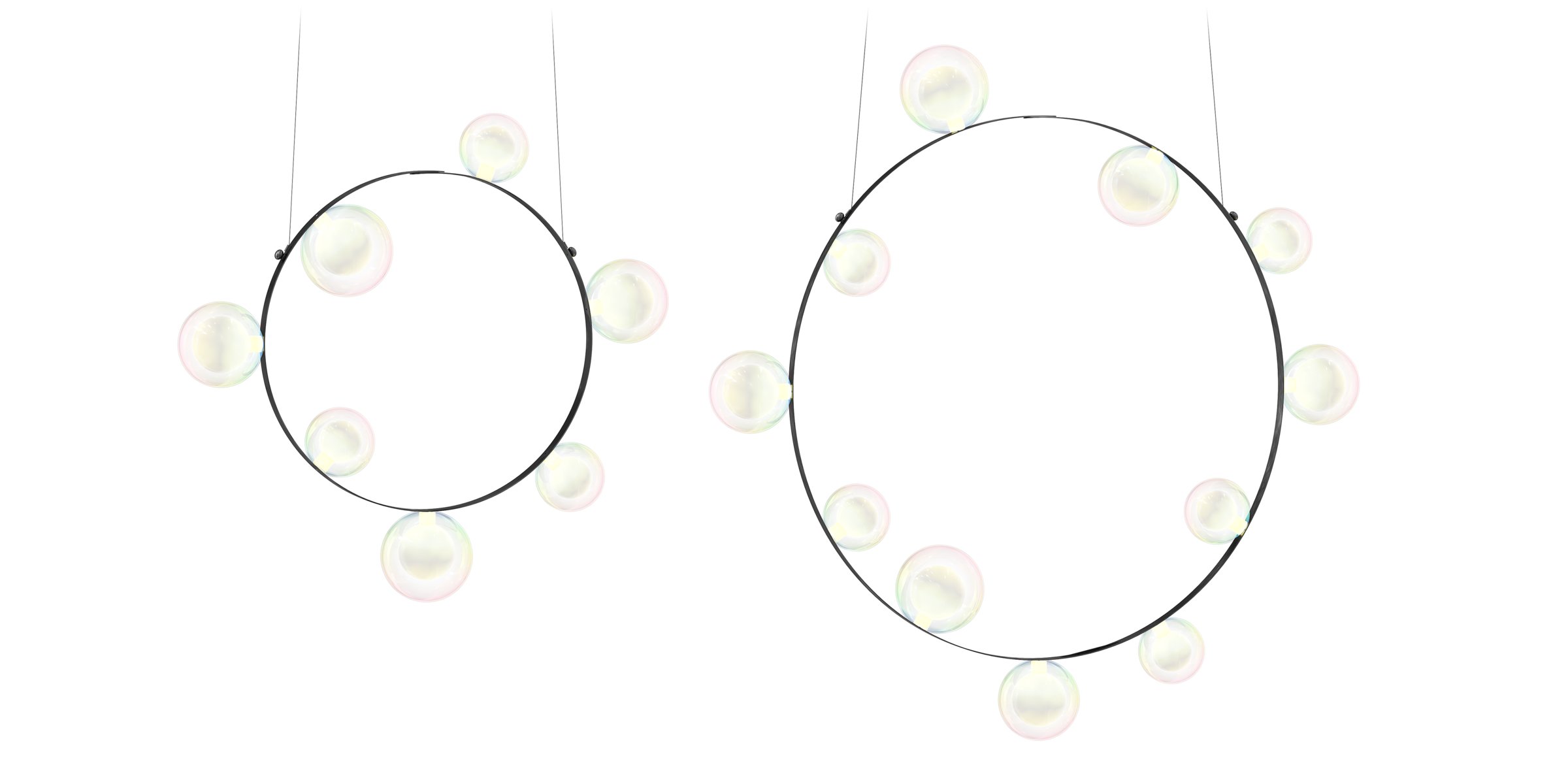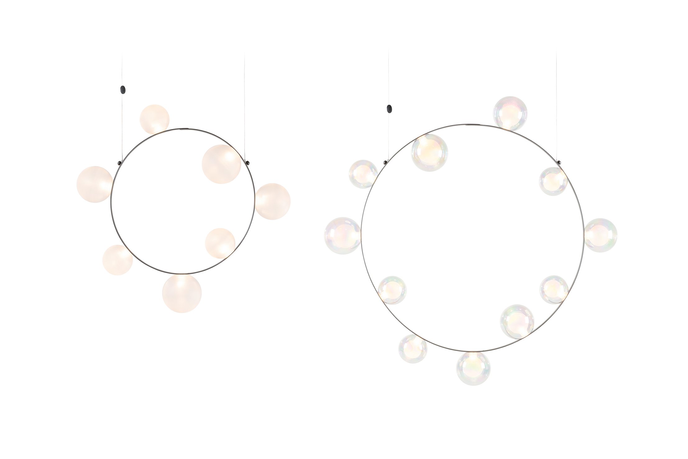Hubble Bubble, designed by Marcel Wanders, takes you back to the freedom of blowing bubbles and running barefoot in the open air. Evoke a moment in which a frisky spirit is set free, only to find its way back home with an everlasting memory. These recollections are symbolized in each element of the Hubble Bubble. The glass bubbles are vailable in oil-iridescent and frosted versions and the Hubble Bubble can be hung both horizontally and vertically. Freedom is in the air…