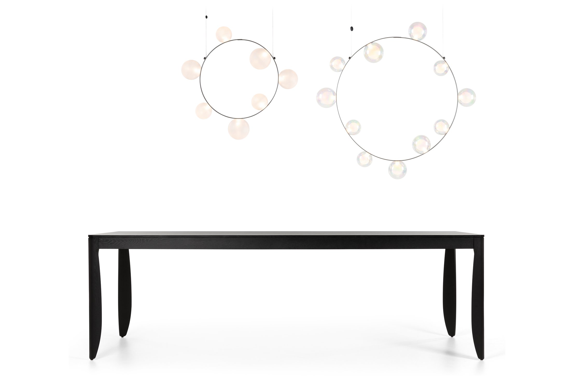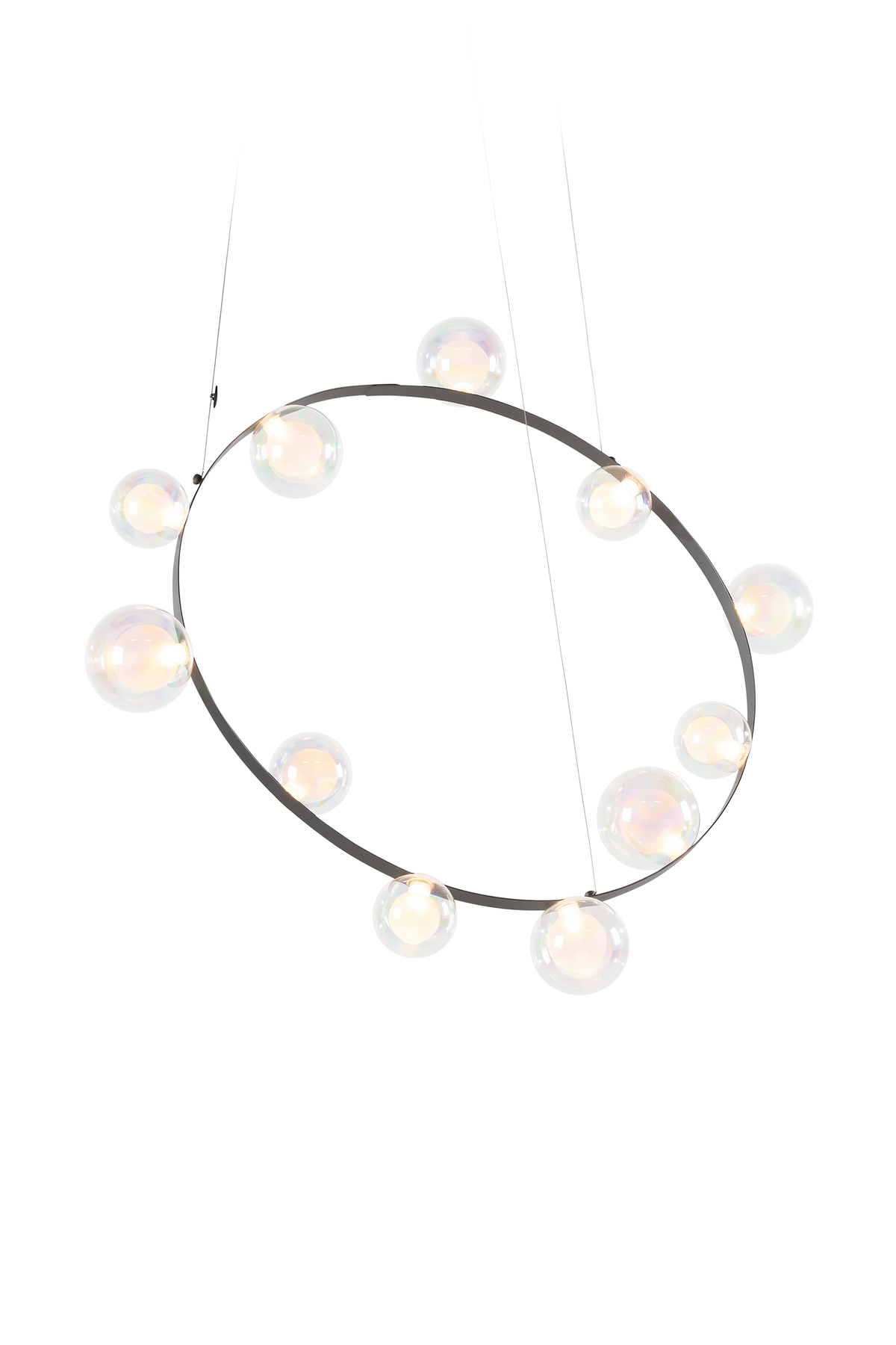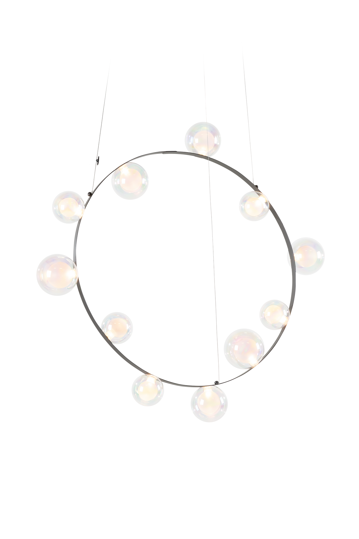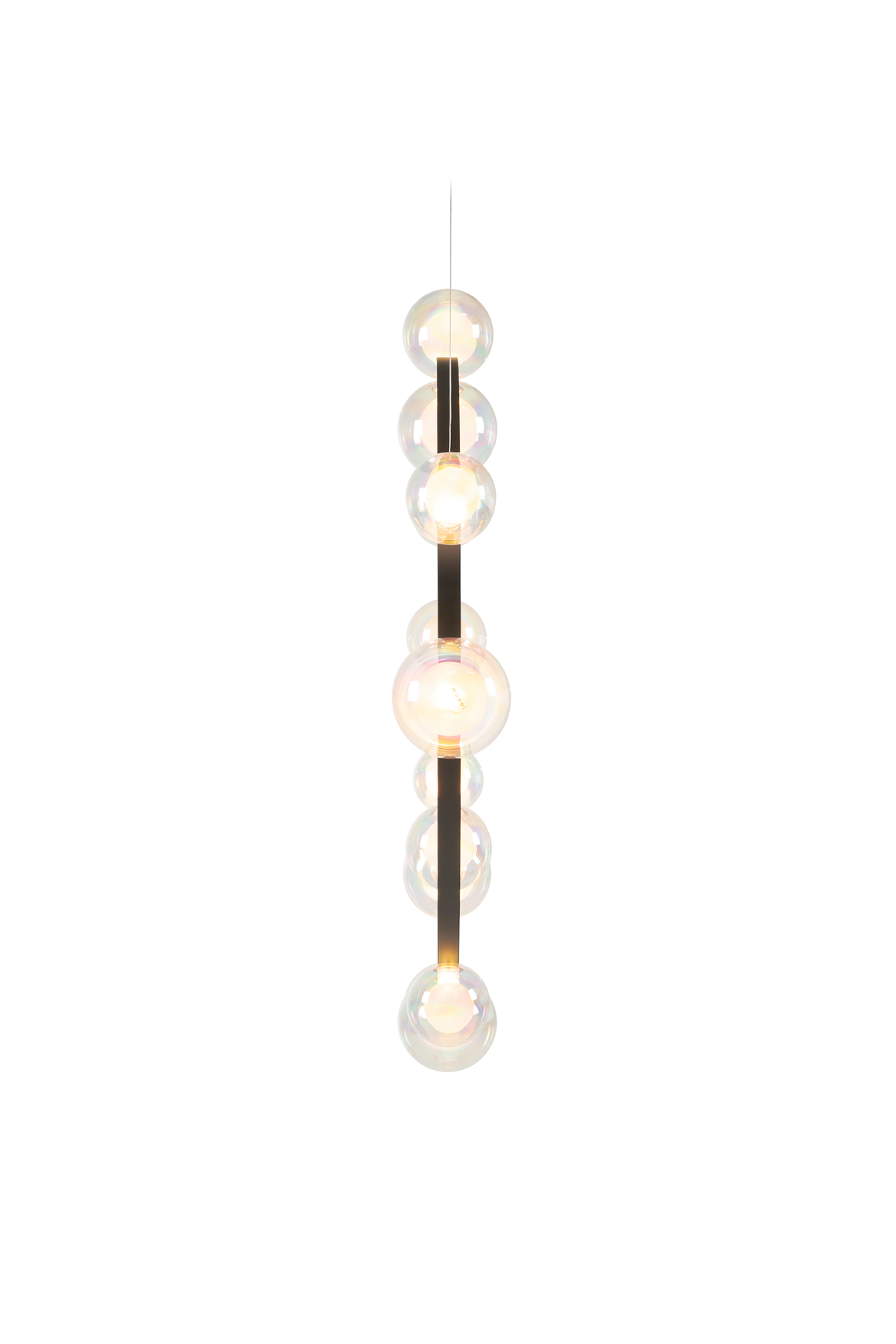 Hubble Bubble, designed by Marcel Wanders, takes you back to the freedom of blowing bubbles and running barefoot in the open air. Evoke a moment in which a frisky spirit is set free, only to find its way back home with an everlasting memory. These recollections are symbolized in each element of the Hubble Bubble. The glass bubbles are vailable in oil-iridescent and frosted versions and the Hubble Bubble can be hung both horizontally and vertically. Freedom is in the air…