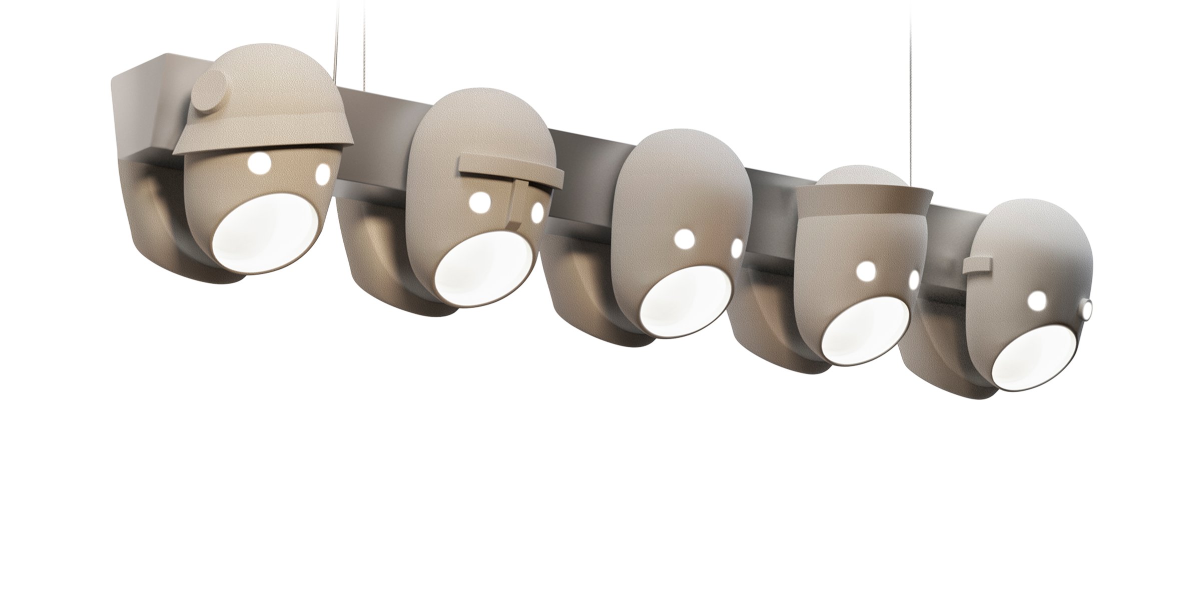 ‘The Party’ is inspired by a clan of strong, captivating personalities. Their casted ceramic faces bring to light our fascination with secrets, family dynamics and intrigue. If seen together, as a splendid party, they brighten up the stage with their cool playfulness. Yet behind the lamps’ composed fa?ades a mischievous side seeps through and touches our imagination. The characters that join The Party each have an intriguing story that connects them: the want-to-be aristocrat, the black sheep, the opportunist, the patriot and the evil mastermind. Fragments of their personalities appeal to our own hidden side, stimulating recognition, interest and curiosity. The lamps share the same basic tactile feel, a subtle roughness given by the granular ceramic finish, but are distinguished by their individual style and detailing.