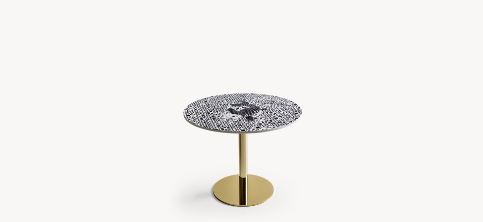 Tavolino con piano in Corian? e basamento in acciaio dorato lucido.