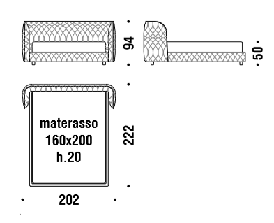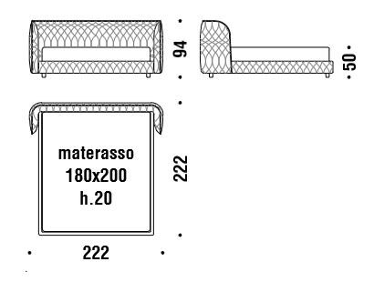 Struttura in legno rivestita in poliuretano espanso a densità differenziata. Supporti rete regolabili in altezza, i piedi sono in polipropilene nero 70mm. Può contenere solo materassi con misure standard europee. Il tessuto utilizzato per rivestire la collezione è trapuntato su disegno della designer Patricia Urquiola. I letti Redondo sono sfoderabili.