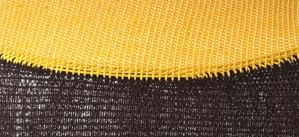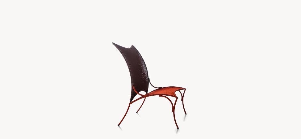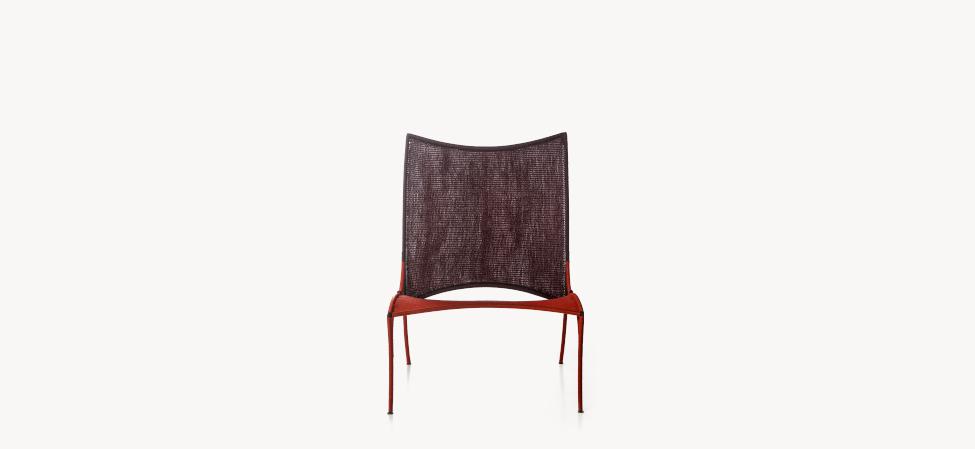 Struttura in acciaio verniciato e fili colorati in polietilene intrecciati a mano.