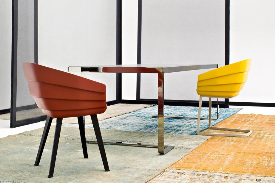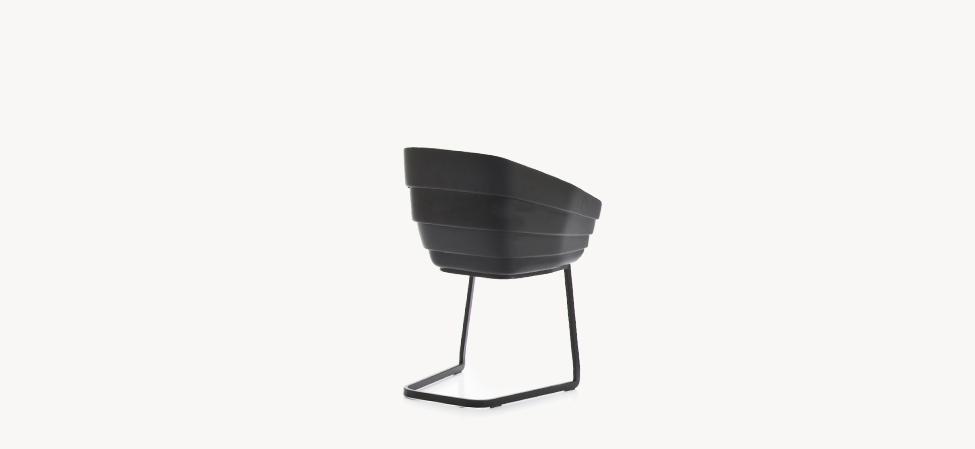 Scocca in poliuretano integrale strutturale e basamento cantilever in acciaio verniciato. La sedia cantilever è impilabile fino a 4 unità.