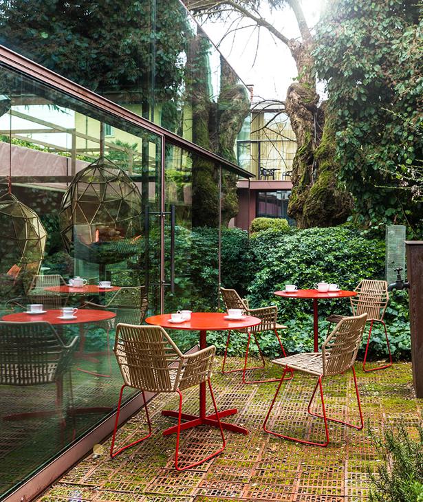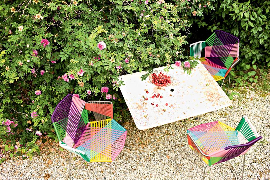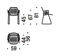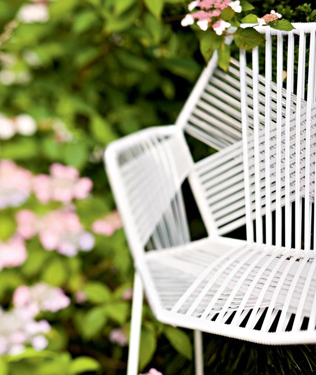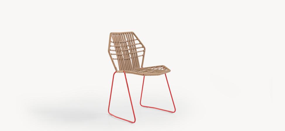 Struttura in acciaio inox o verniciato per uso esterno. Sottopiedi in PVC. Intreccio in filo tecnopolimero.