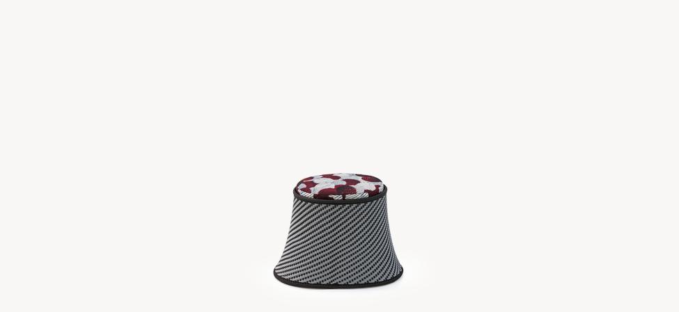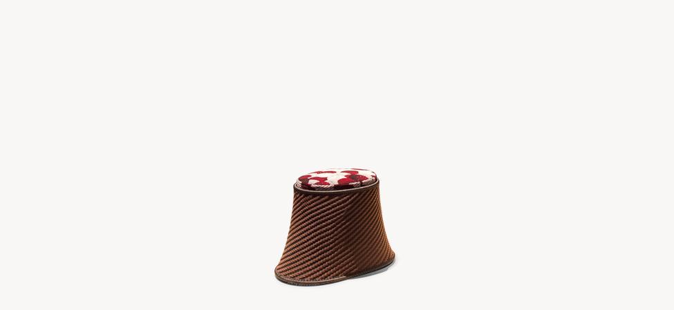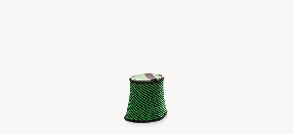 Struttura in acciaio verniciato e fili colorati in polietilene intrecciati a mano. Il pouf è corredato da un cuscino in tessuto stampato. Consigliato per interni solamente.