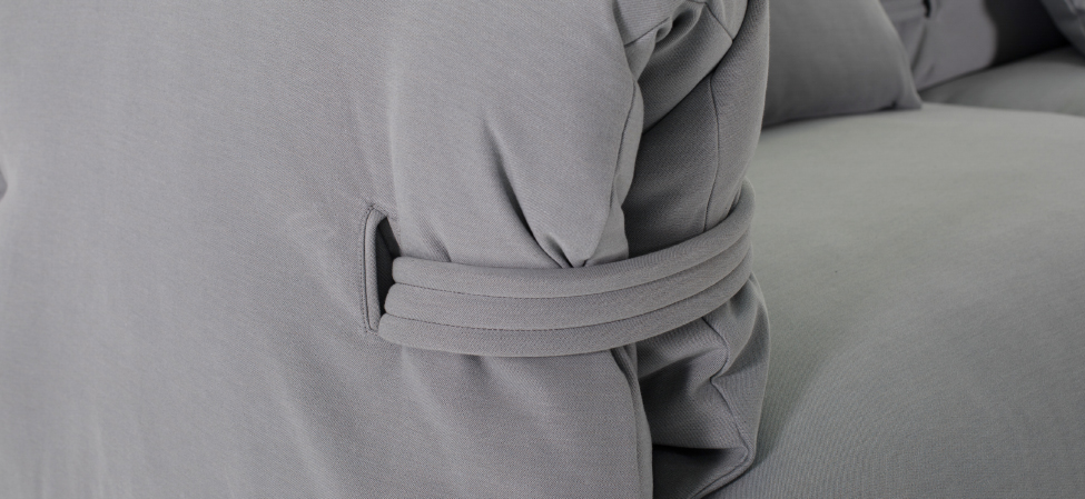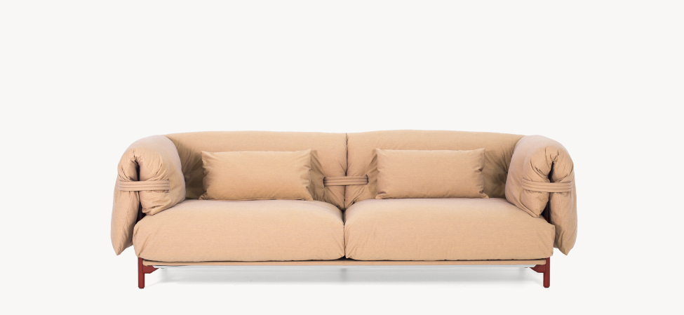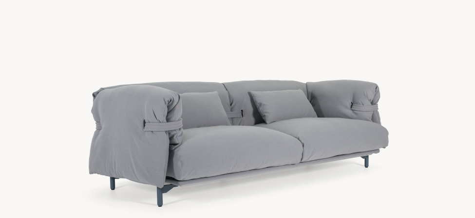 Confort e morbidezza prima di tutto. Un divano open source, una scelta progettuale che privilegia l’aspetto di comodità della seduta che si vuole sempre più avvolgente e morbida nel suo impatto sia visivo che formale. La struttura è abbracciata da cinghie di maglia che si insinuano tra i morbidi cuscini invogliando al puro relax. Il rivestimento a pieghe sottolinea la spensieratezza non definita della forma, accentuata dall’uso del tessuto a maglia per le cinghie che la contengono. Un divano quindi destrutturato dalla costruzione atipica: una struttura in alluminio che può essere composta in libertà unendo i diversi componenti che interagiscono tra loro all’insegna della personalizzazione armoniosa.