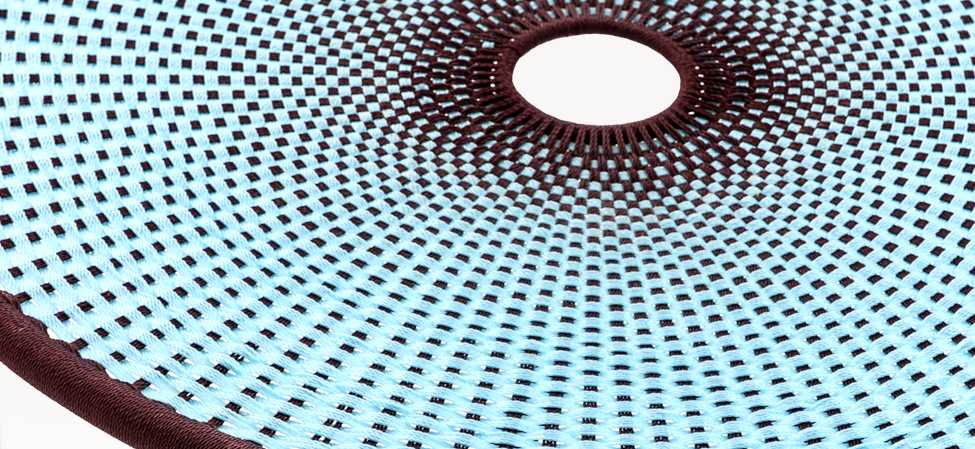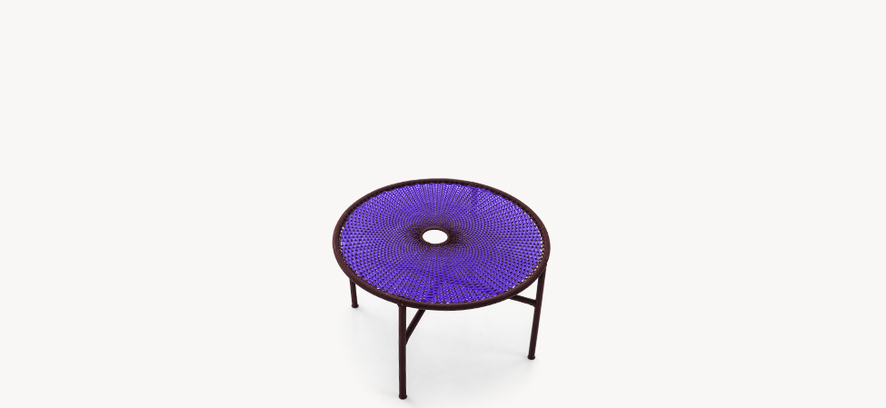 Struttura in acciaio verniciato e fili colorati in polietilene intrecciati a mano. Sottopiedi in PVC.