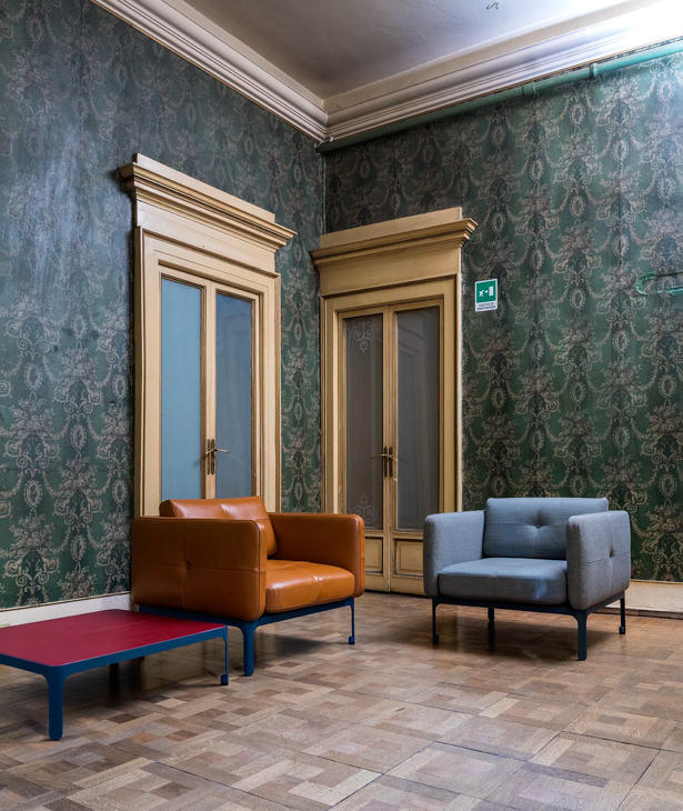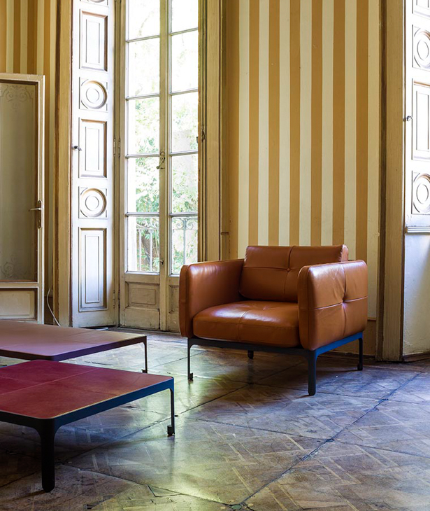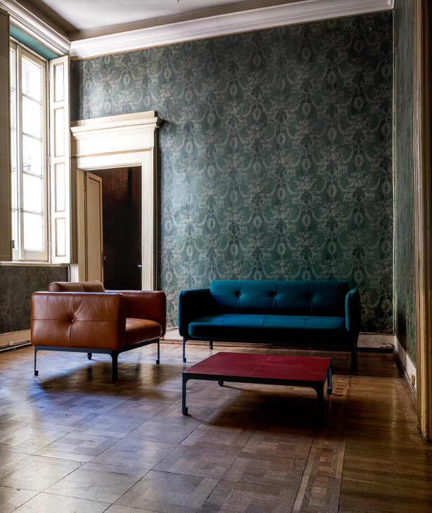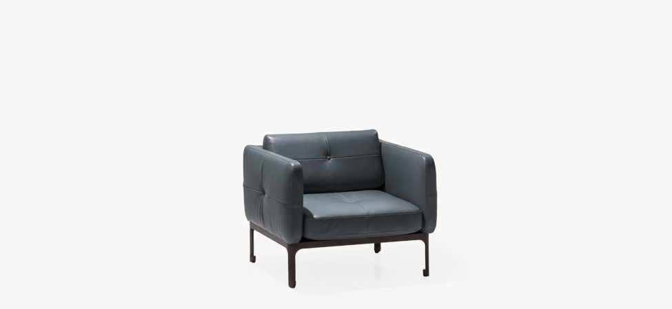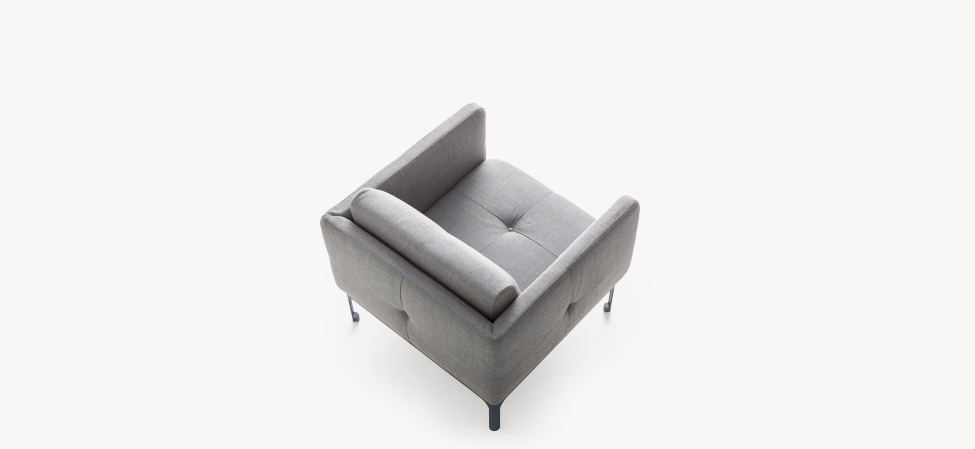 Poliuretano espanso ignifugo a densità differenziate e fibra poliestere con struttura interna in legno. Base in lamiera di acciaio tagliata al laser, sagomata e verniciata a polveri. La collezione Modernista non è sfoderabile.