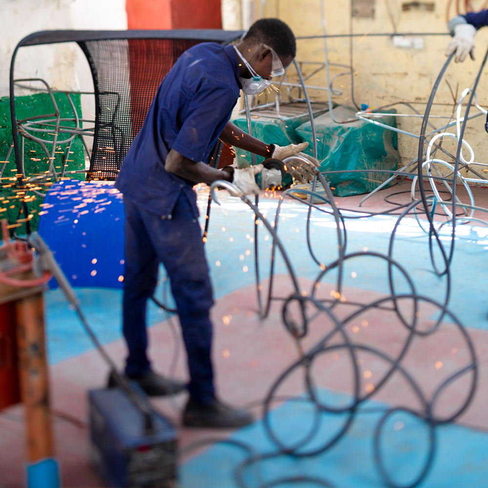 La collezione di sedute è realizzata intrecciando il filo in polietilene utilizzato tradizionalmente in Africa per le reti da pesca. Progetti non-omologati per antonomasia, diversi e originali, lavorati interamente a mano a Dakar, in Senegal, nei laboratori M’Afrique.