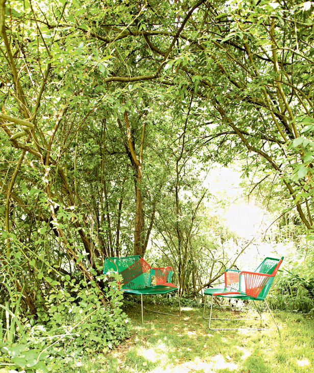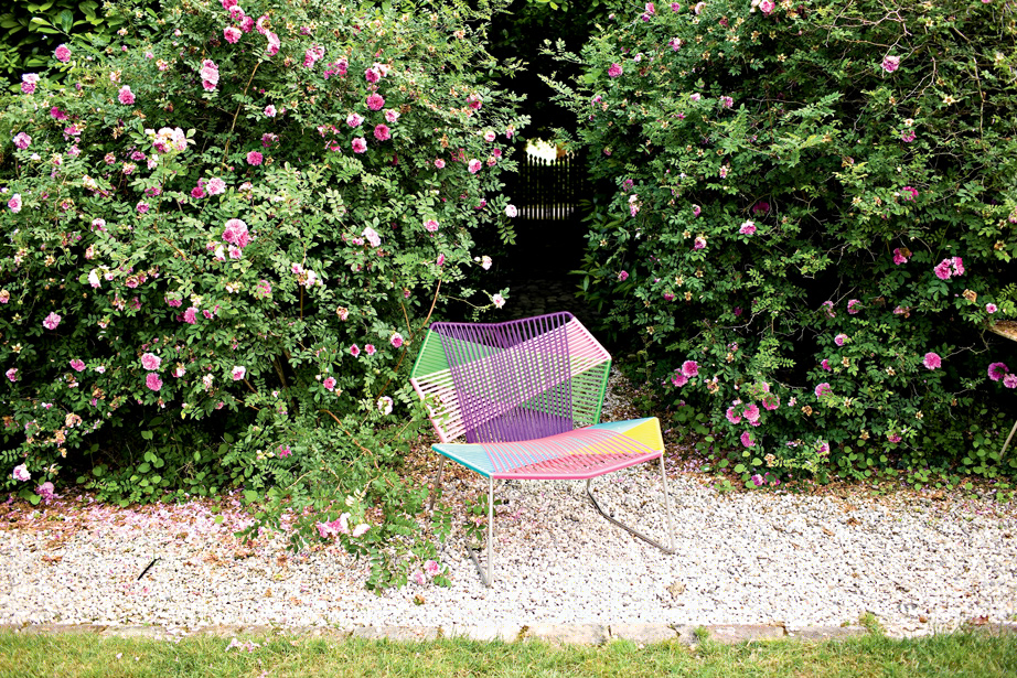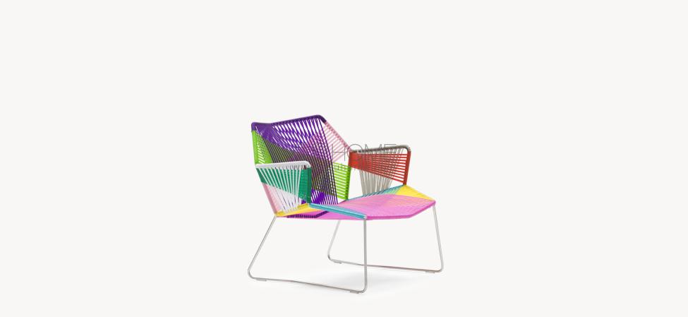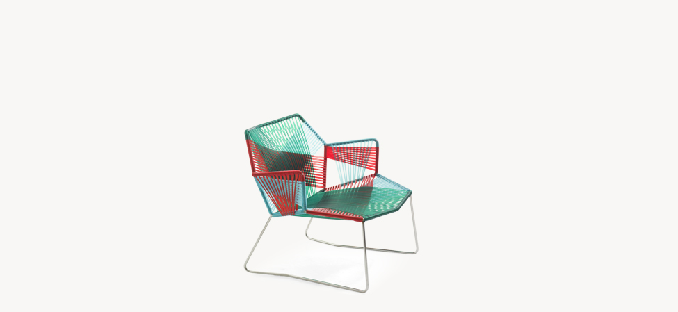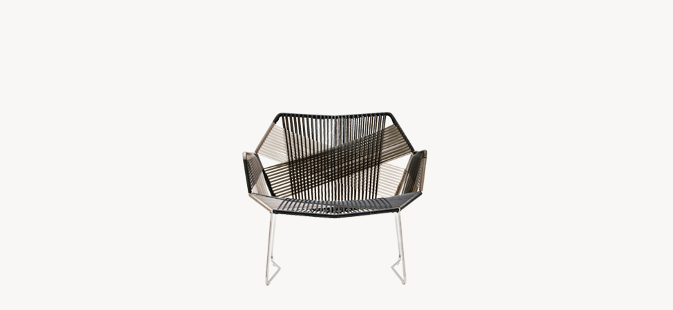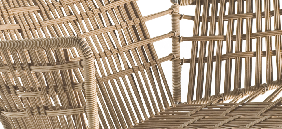 Struttura in acciaio inox o verniciato per uso esterno. Sottopiedi in PVC. Intreccio in filo tecnopolimero.