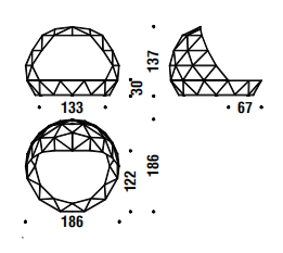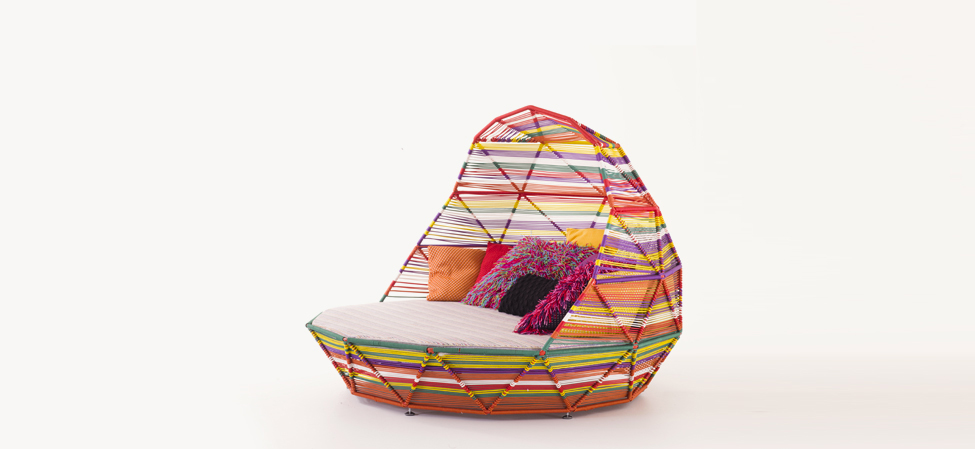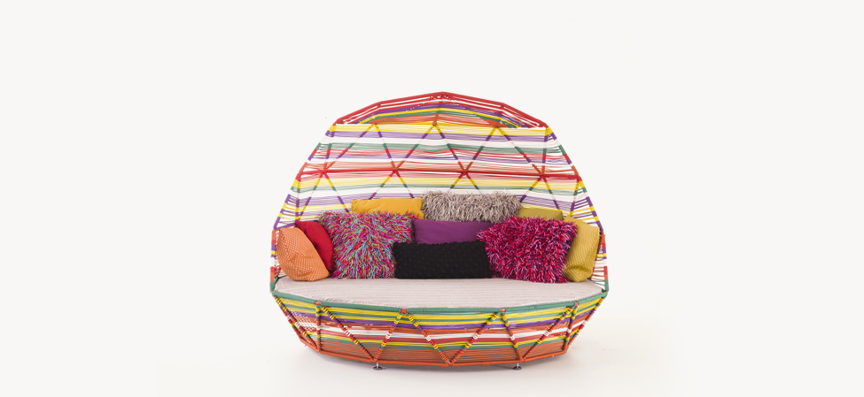 Struttura in acciaio verniciato rosso RAL 3020 e intreccio in filo tecnopolimero multicolor. Il materasso del Day bed è in poliuretano espanso adatto per l’esterno; i cuscini sono in fibra poliestere per uso esterno. La collezione viene fornita di cuscini.