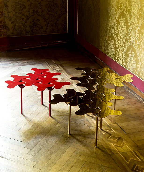 Top in lamiera di acciao e base in tubolare verniciati a polveri o in versione cromata oro.