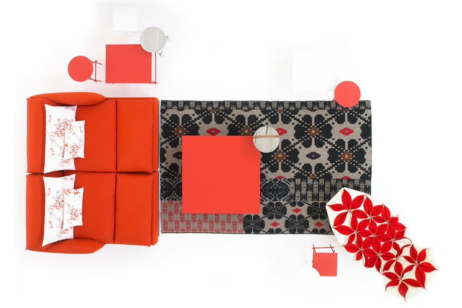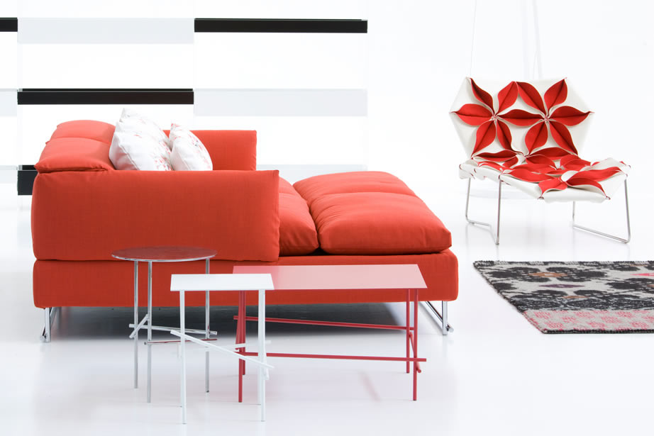 Raffinato e rassicurante, lusso understatement dal sapore vagamente orientale. Semplice e minimal in posizione normale; di grande comodità quando lo schienale, dotato di meccanismo d’inclinazione, si alza. Il nome – Shanghai – richiama i bastoncini di legno colorato del gioco, trasposti nel progetto nei tubi di acciaio verniciato dei piedi del divano e delle gambe dei tavolini. La comodità è un elemento intrinseco, enfatizzata dalla presenza di cuscini in piuma d’oca rivestiti con tessuti a colori neutri e puri, ai quali fanno da contrappunto le macchie di colore dei cuscini decorativi e dei tavolini laccati prugna, verde smeraldo, paprica e rosso lacca.