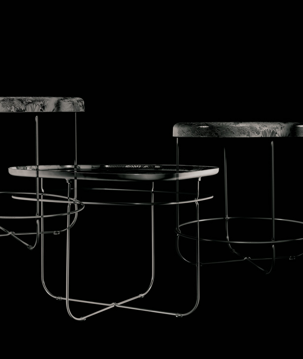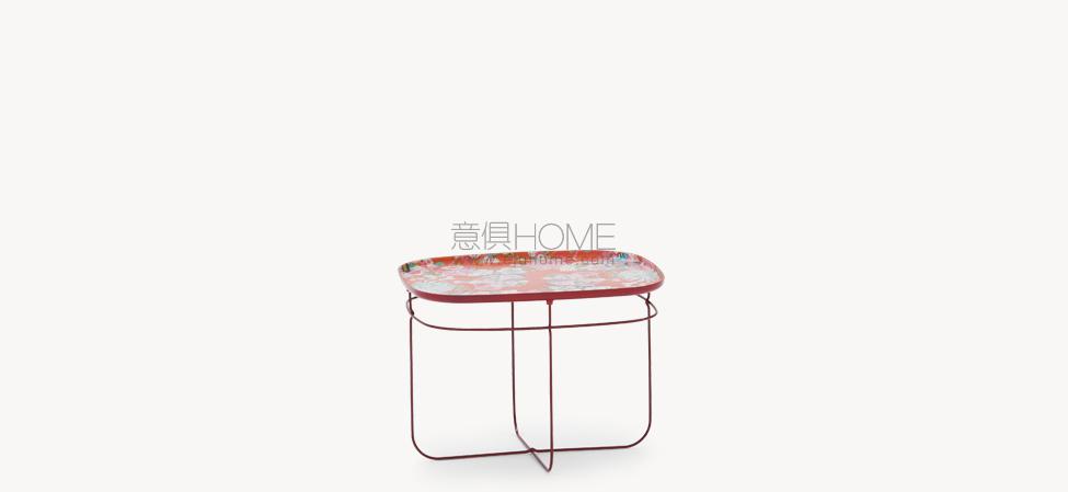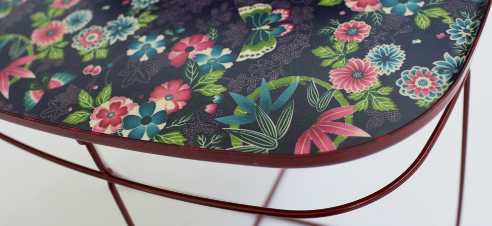 Tavolino dalla struttura leggera in filo di acciaio rosso (RAL 3003), contrapposta all’importante decorazione che usa il tessuto di Kimono tradizionali co-stampato con resina poliestere per il piano d’appoggio.