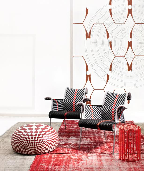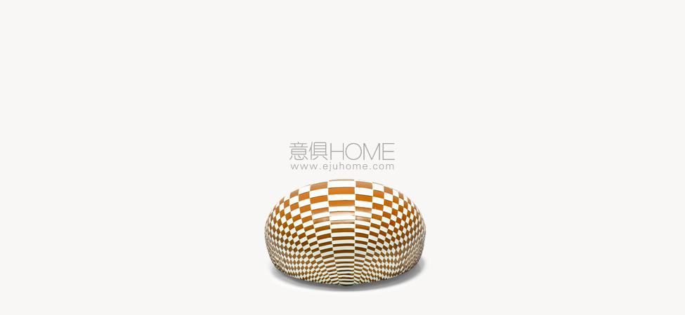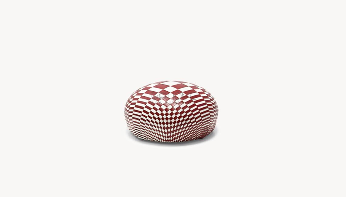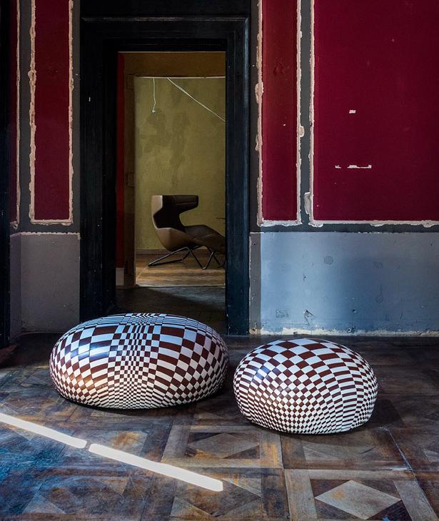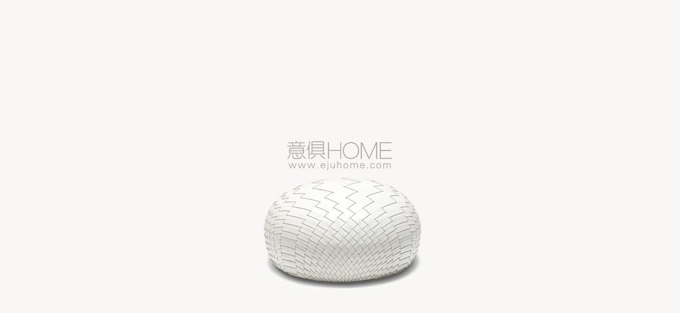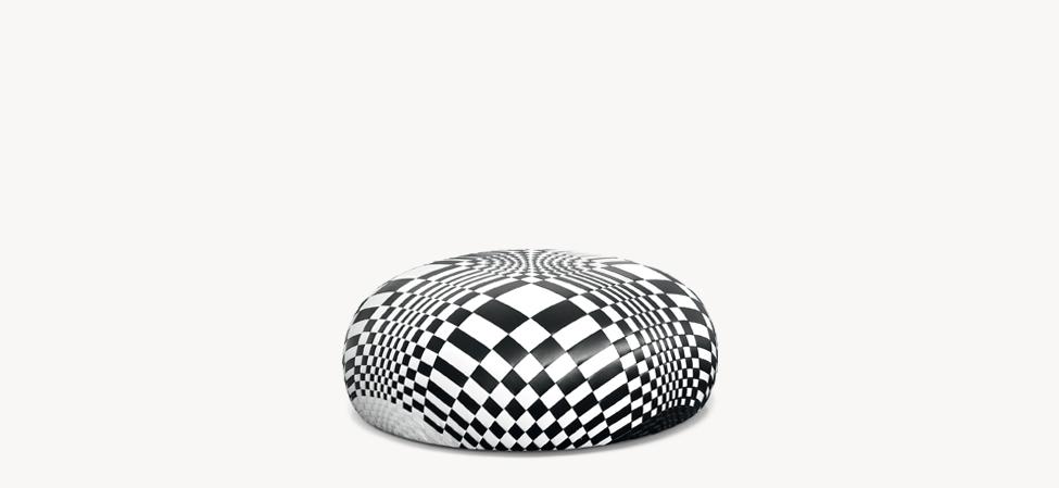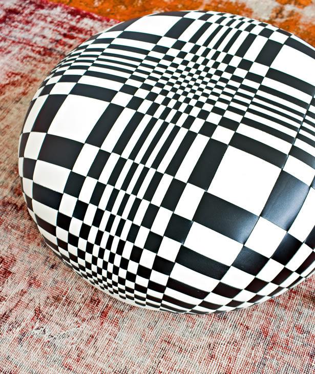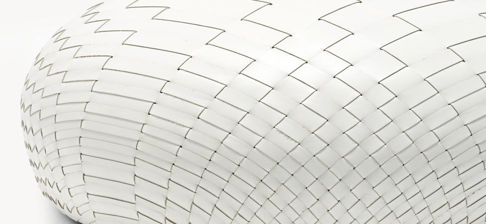 Un pouf rotondo come una goccia d’acqua, dove le linee della tensione superficiale si trasformano in un intreccio di strisce di pelle. Come per alcune opere optical degli anni ’50, Nendo studia i processi percettivi alla base del movimento, traducendoli in una disposizione di linee e forme geometriche organizzate secondo un preciso approccio matematico. L’effetto ottico, enfatizzato dai rapporti di estensione e dall’uso del bianco e nero, nella sua semplicità permette una lettura multipla dell’oggetto, allo stesso tempo strutturale e di superficie.