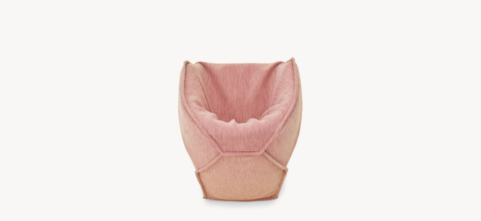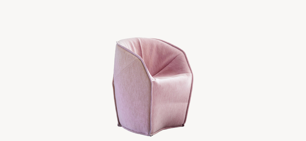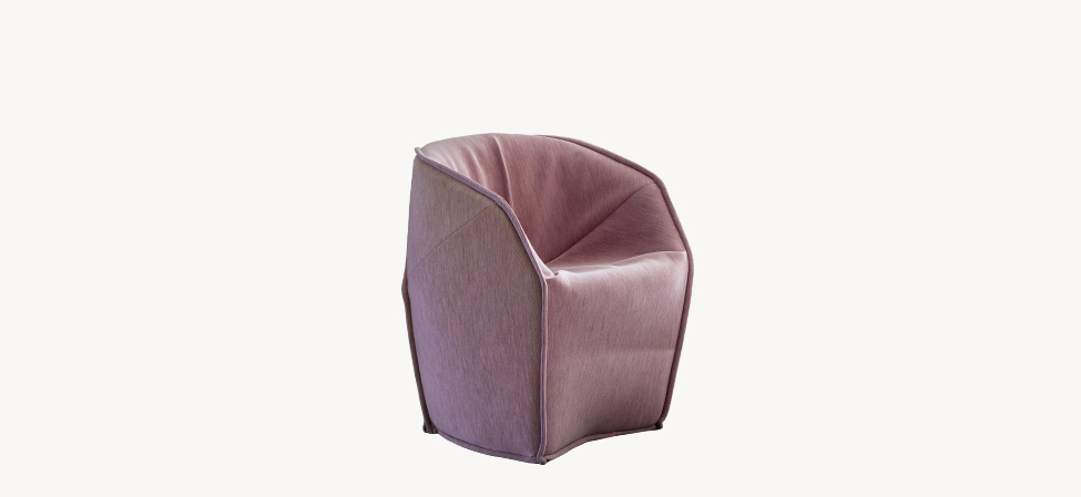 Blocchi smussati dal taglio di una lama immaginaria. L’ordine geometrico è rotto, travolto a favore di un movimento, di un margine che attraversa i perimetri. Le facce rendono evidente la nervatura; alcune cuciture, evidenti come imbastiture, la disegnano, altre scompaiono. L’utilizzo è libero, la superficie morbida. La forma esterna, dal punto di vista dei volumi, appare indipendente dalla struttura e dall’imbottitura interna. Divano, poltrona, poltroncina: un sistema componibile dove ogni elemento mantiene indipendente il carattere, per funzione e presenza scultorea.