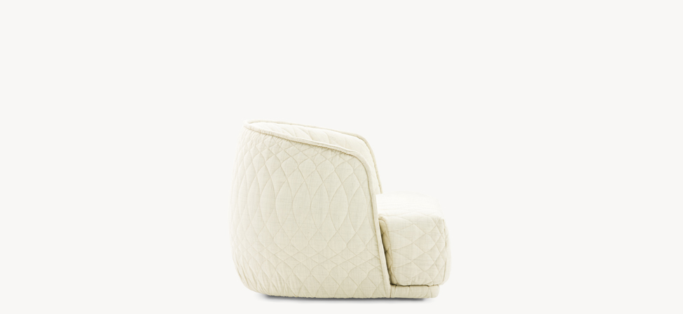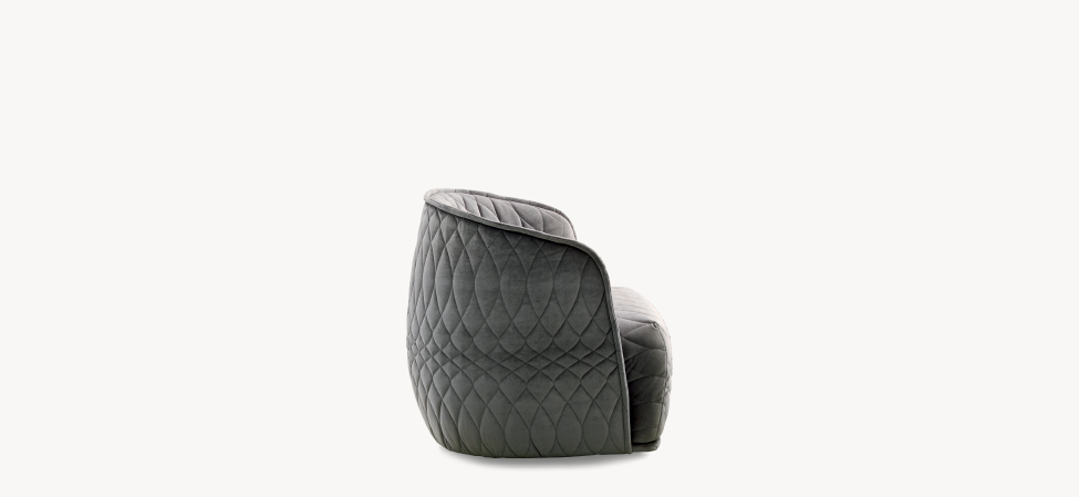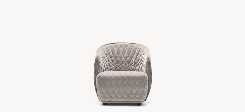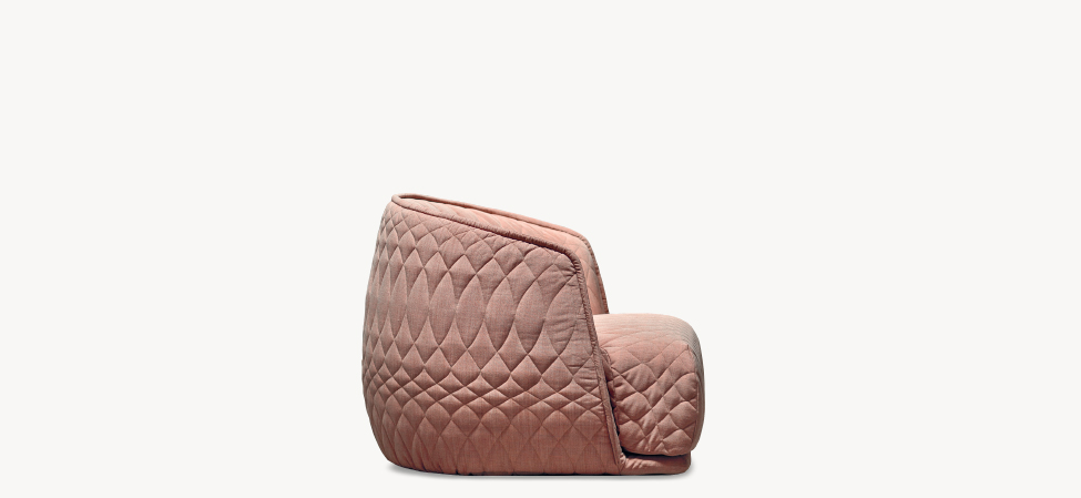 Una collezione caratterizzata dall’accostamento di due volumi, una scocca imbottita che avvolge in continuità i grandi cuscini di seduta. Forme curve esaltate dall’assenza totale di spigoli e dalla morbidezza del tessuto, stimolo sensoriale impreziosito da un decoro trapuntato dove il filo, come una matita, segna un’elegante geometria tridimensionale. Redondo, nel disegno, si ispira agli interni imbottiti delle auto americane degli anni ’50 e ’60, alle forme morbide della carrozzeria, al comfort on-the-road che accompagnava nei lunghi viaggi tra le East e la West Coast. Il punto di vista è, per chi guarda, quello di un palcoscenico dove accadono piccole storie quotidiane.