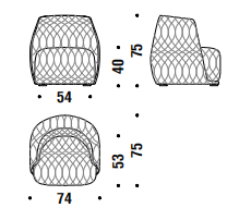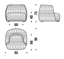 Espanso schiumato a freddo ignifugo e fibra poliestere con struttura interna in acciaio. Piedi in polipropilene. Il tessuto utilizzato per rivestire la collezione è trapuntato su disegno della designer Patricia Urquiola. La collezione Redondo è sfoderabile.