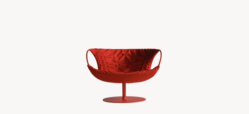 Scegliere un punto di ricamo, un’estetica classica e decontestualizzarla. Fondere artigianalità e processo industriale e dilatare l’immaginario, generando una figura sofisticata ed elegante capace di penetrare l’universo simbolico femminile. E di ampliarlo. Due anelli diventano braccioli, ricordando nella purezza dell’esecuzione stilistica una bamboo bag; il guscio, simile per certi versi ai grandi guanti di pelle utilizzati dai giocatori di baseball, è un gilet aperto, pronto per essere indossato, un’alcova intima e accogliente. I ricami laterali – a punto smock – rendono il drappeggio contemporaneo per stile, leggero nella forma, infondendo all’oggetto di seduta la grazia e la raffinatezza proprie di un accessorio personale.