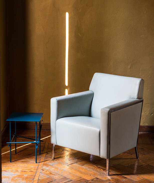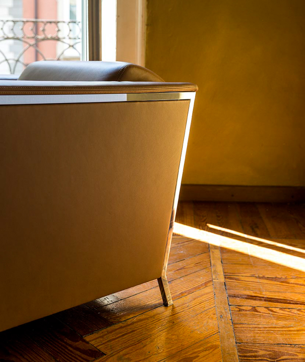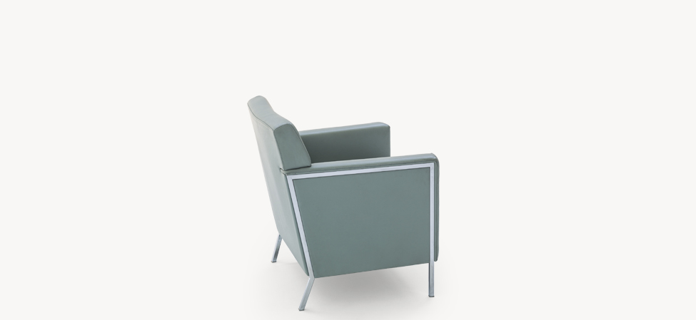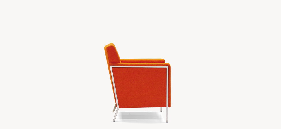 Espanso ignifugo schiumato a freddo con struttura interna in acciaio. Profilo dei fianchi in acciaio cromato o verniciato a polveri. La collezione Steel non è sfoderabile.