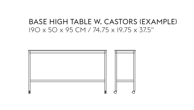 Designed with maximum attention to detail and produced to withstand continual robust use. The Base High Table’s lower frame increases its stability and provides a footrest to the user. Made-to-order sizes are available upon request. Organize and manage cords and wires with the Cable Management. Our Power Outlet can be added to the Base High Table. Bases available in Black or White with matching castors.