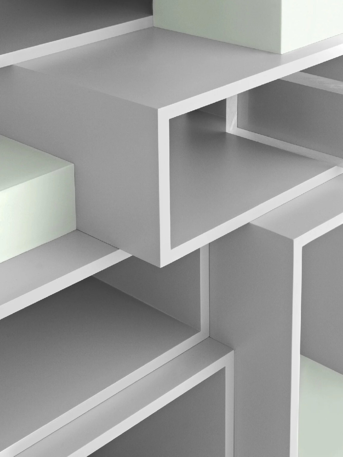Being both versatile and functional, the Stacked Storage System can be arranged and rearranged for the exact aesthetic and functional needs of any space. Seen here is a selection of predesigned sideboard configurations that bring modern storage to any home, workplace or hospitality setting. All modules with backboard can be mounted directly onto the wall.