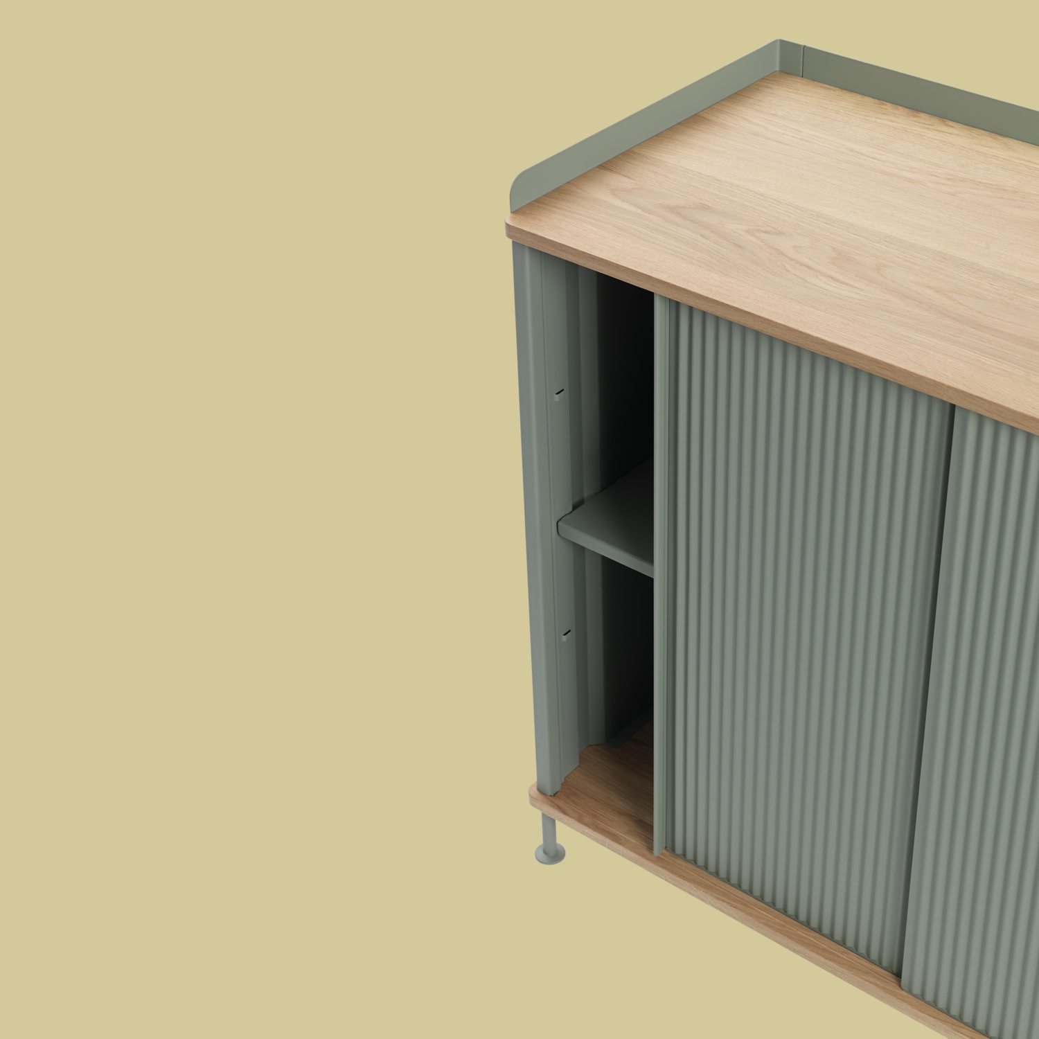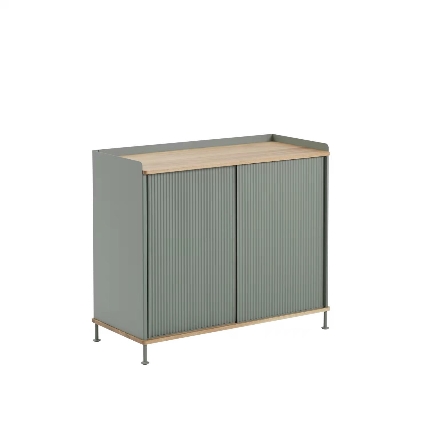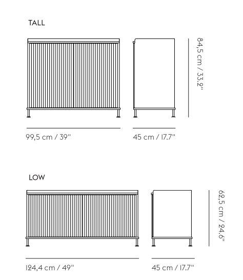 The Enfold Sideboard combines industrial materiality with residential references for a new perspective on modern storage. Made from a lacquered steel that gently enfolds its top and bottom in solid oak, the Enfold Sideboard fuses cold and warm materials for a unique expression, paired with the vibrantly modern expression of its ridged steel doors. The design comes in two sizes: one vertical and one horizontal, both with adjustable shelves to either side of its middle—the horizontal sideboard has one shelf to either side of its middle to be placed across five different levels while the vertical sideboard has one shelf to either side of its middle to be placed across three different levels. Both sizes have outlets for cables inside.