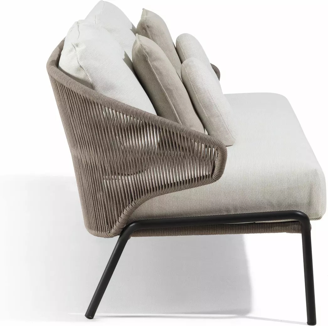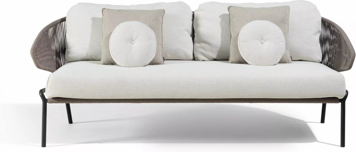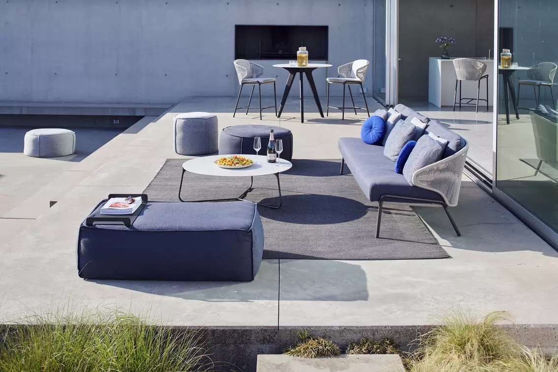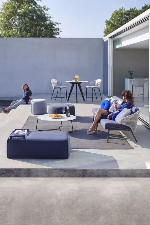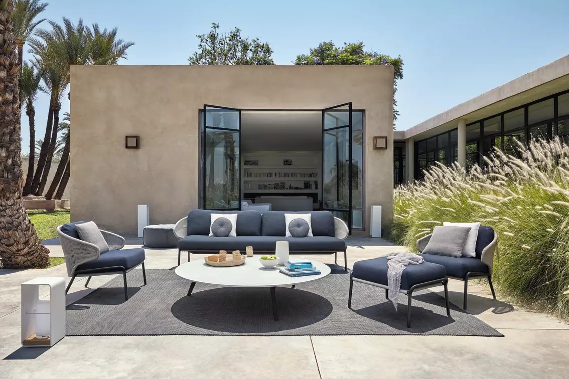 The unique, airy design of the Radoc chair, footstool, lounge chair and sofa collection is perfect for exquisite moments of warmth and closeness. The wrap-around back and armrests, made entirely out of rope, blend seamlessly and give each piece a neomodern yet timeless look and feel. Keep it sober or opt for matching backrest cushions designed for optimal seating comfort for long get-togethers.