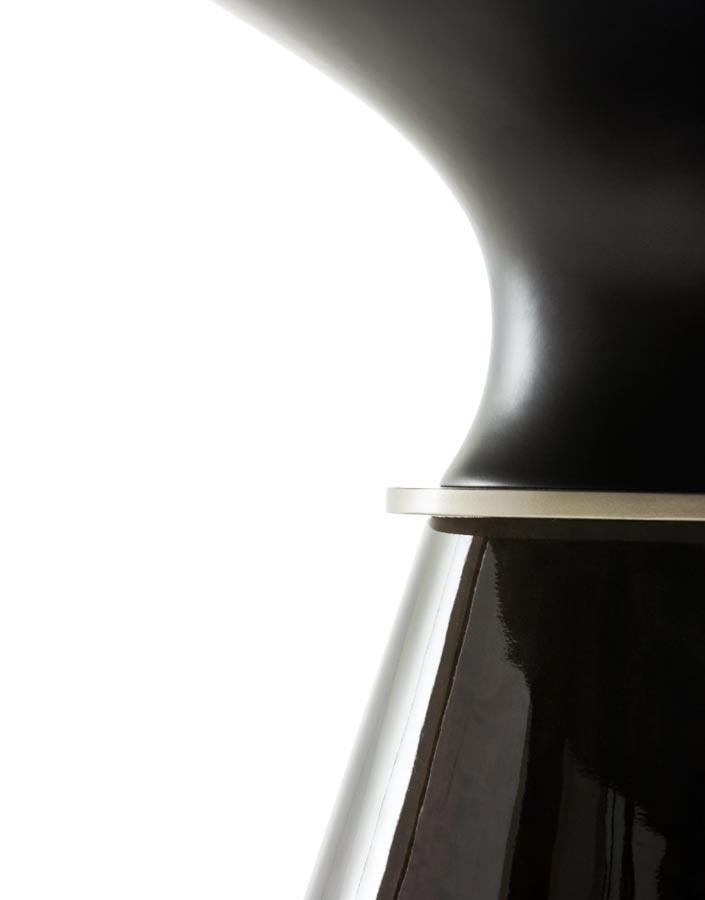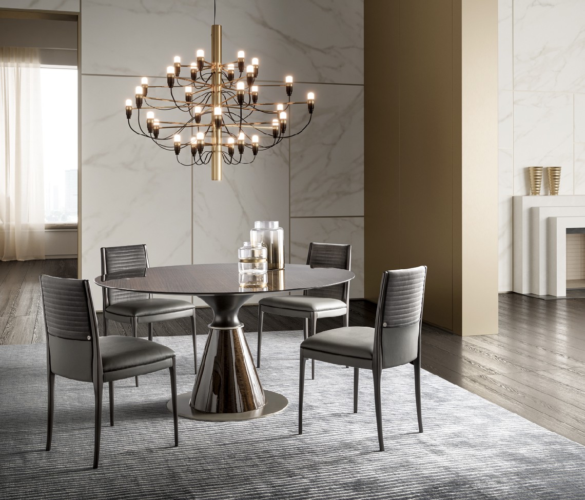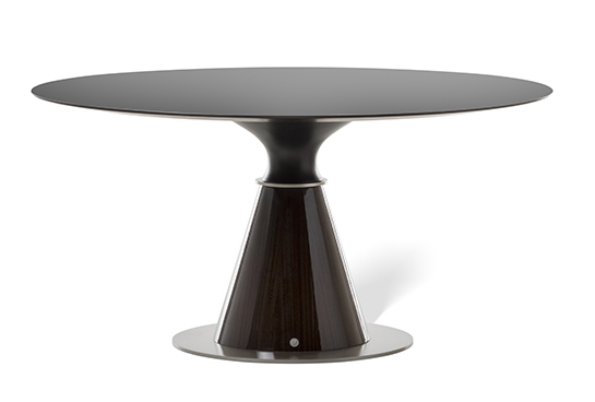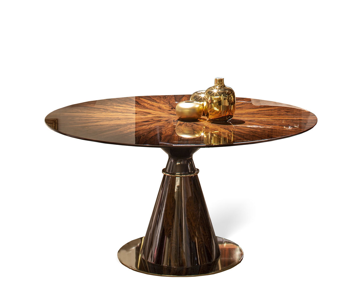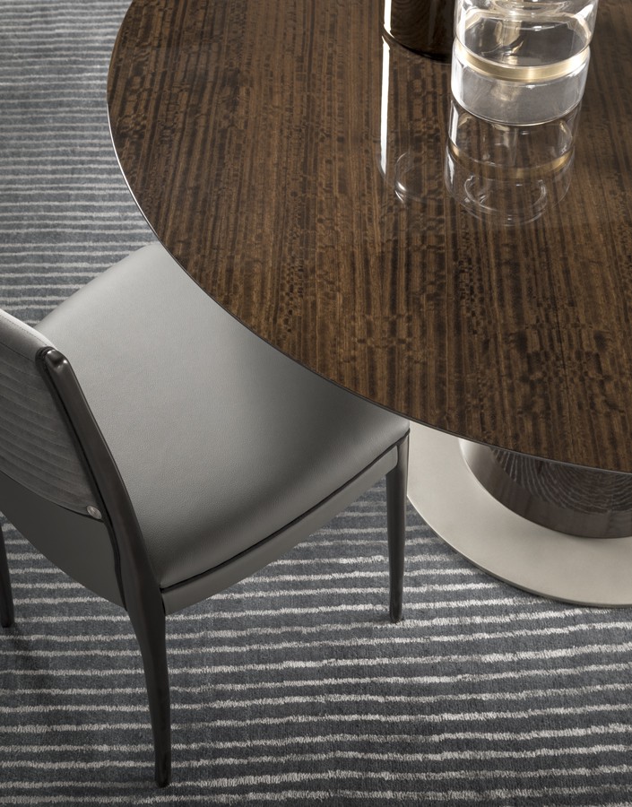 Tavolo rotondo in legno. Dettagli in metallo laccato opaco color argento satinato.