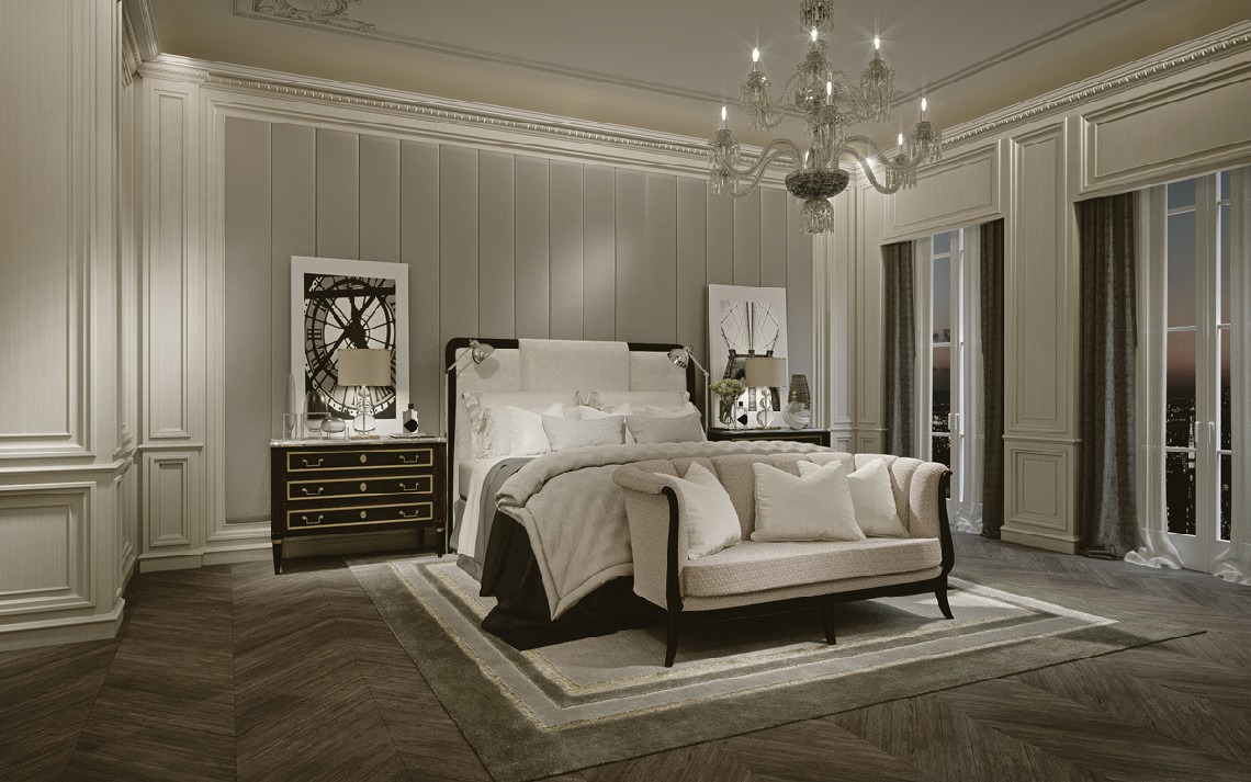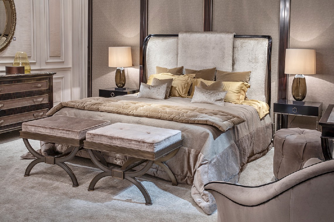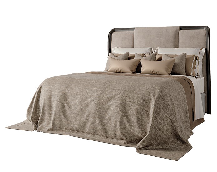 King Size Bed. Solid wood structure in ebony-coloured polishing. Headboard with topside padding. Sommier base completely padded. Upholstered in fabric or leather.