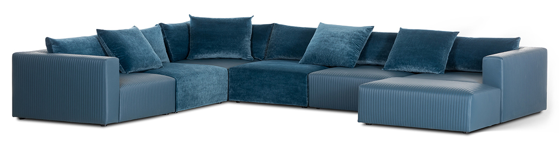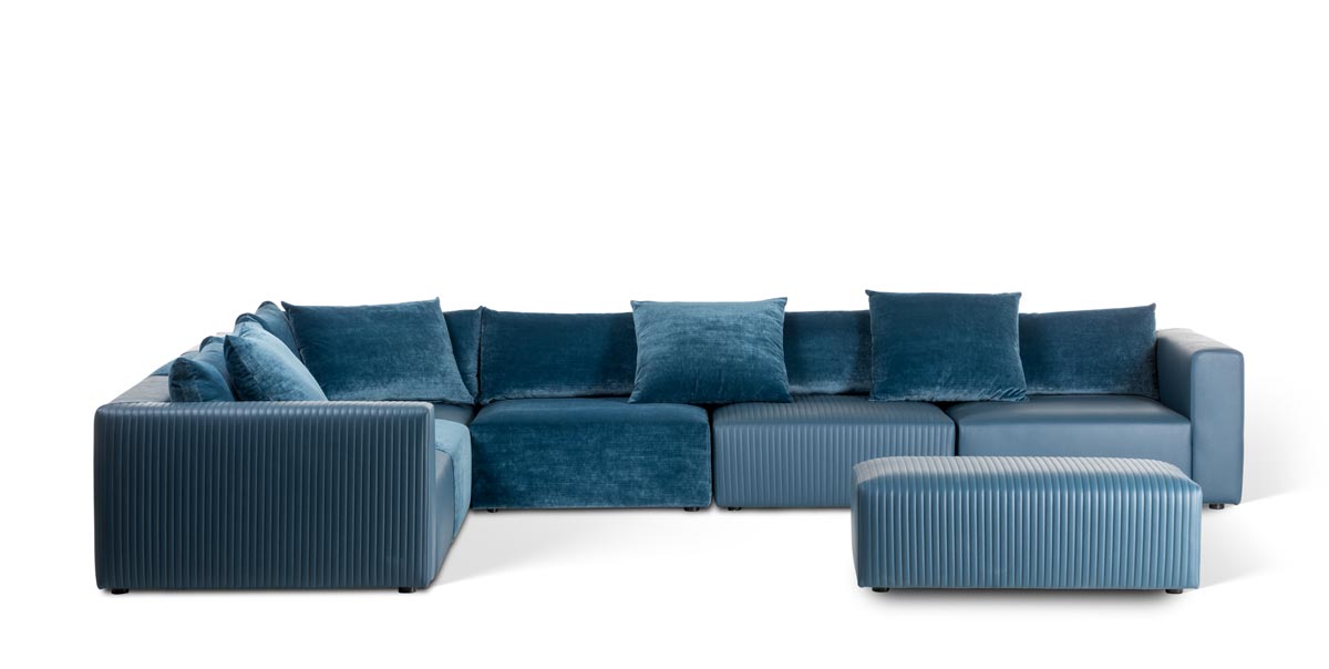 Divano componibile imbottito con rivestimento in tessuto o pelle.
