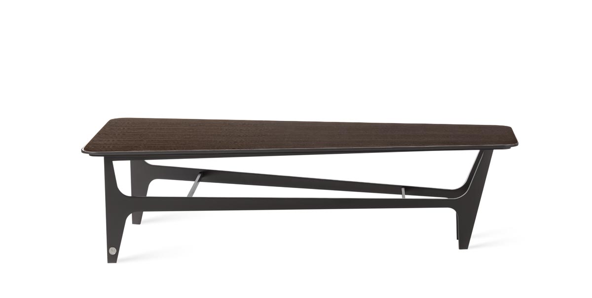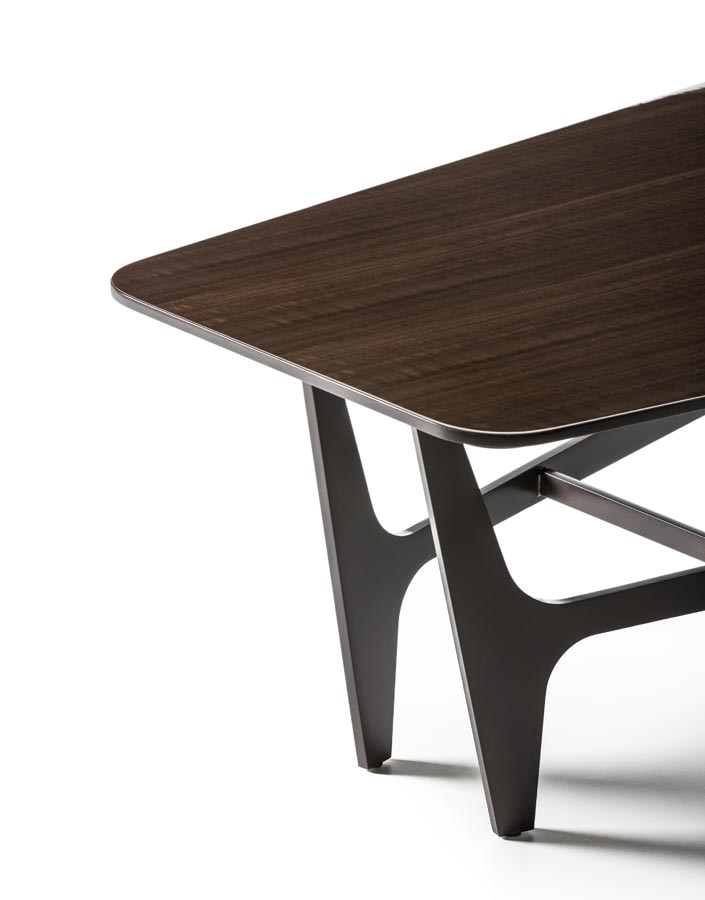 Tavolino con top in legno o marmo e base laccata color metallo.