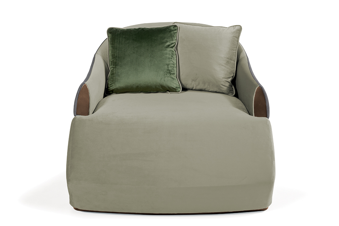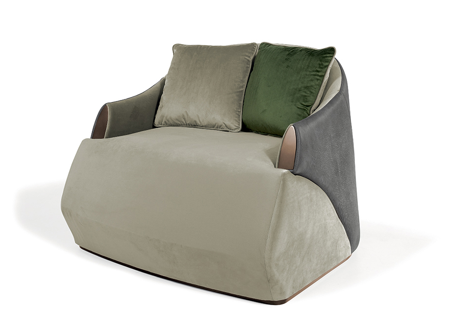 Armchair with structure in wood, upholstery in fabric or leather. Bronze lacquered details.