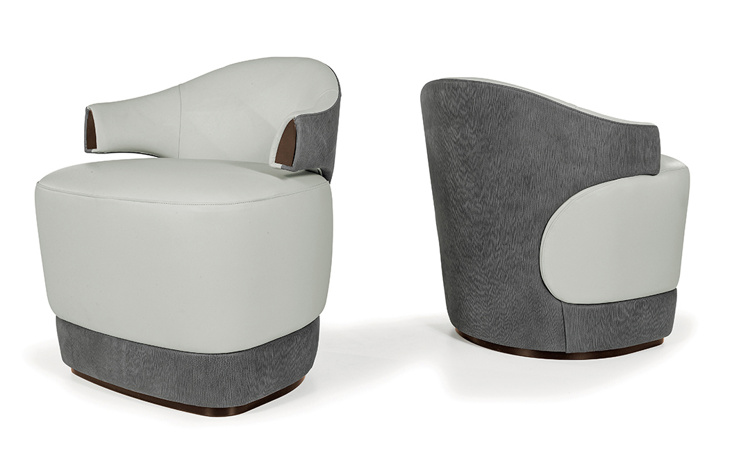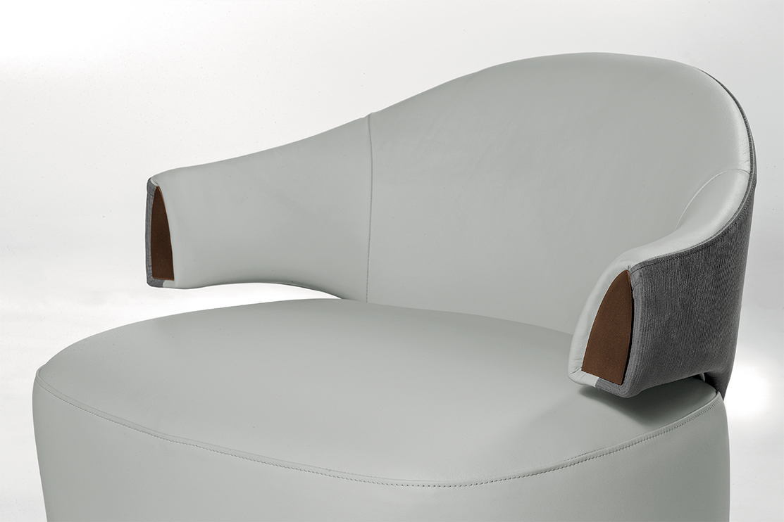 Poltrona con struttura in legno e rivestimento tessuto o pelle. Dettagli laccati bronzo.