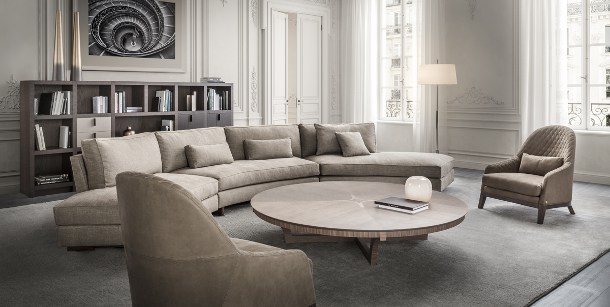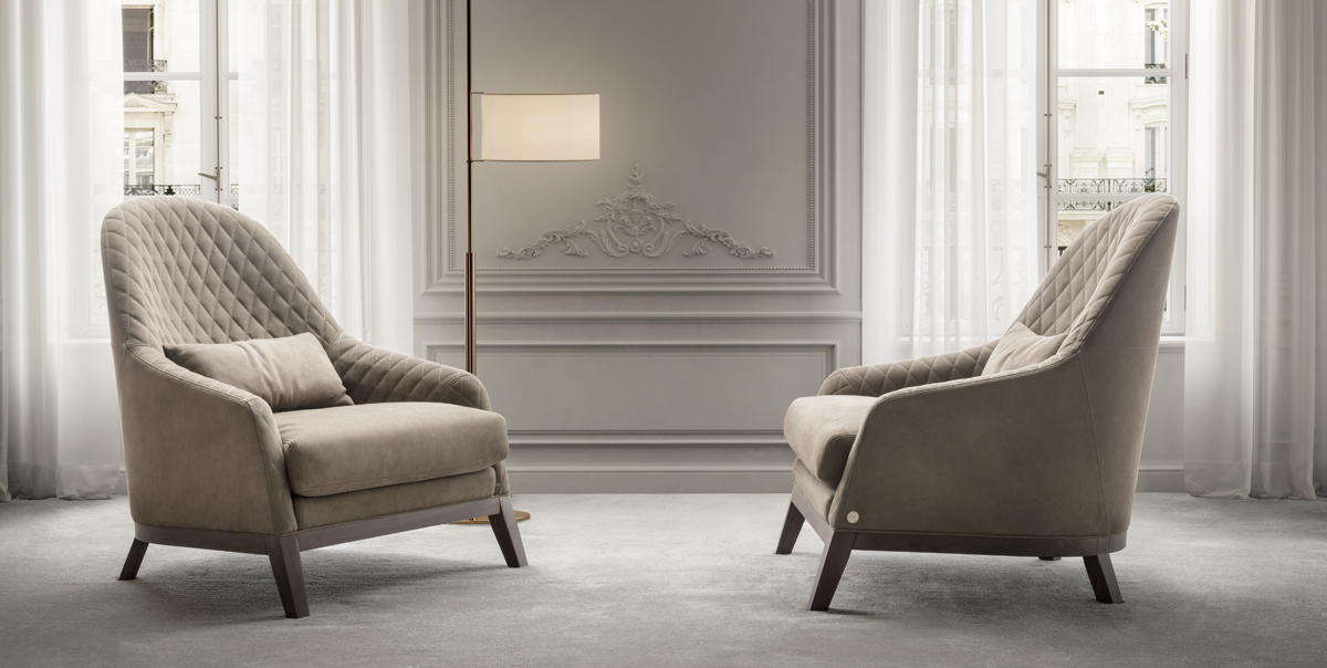 Poltrona con struttura in legno. Rivestimento in tessuto e pelle.