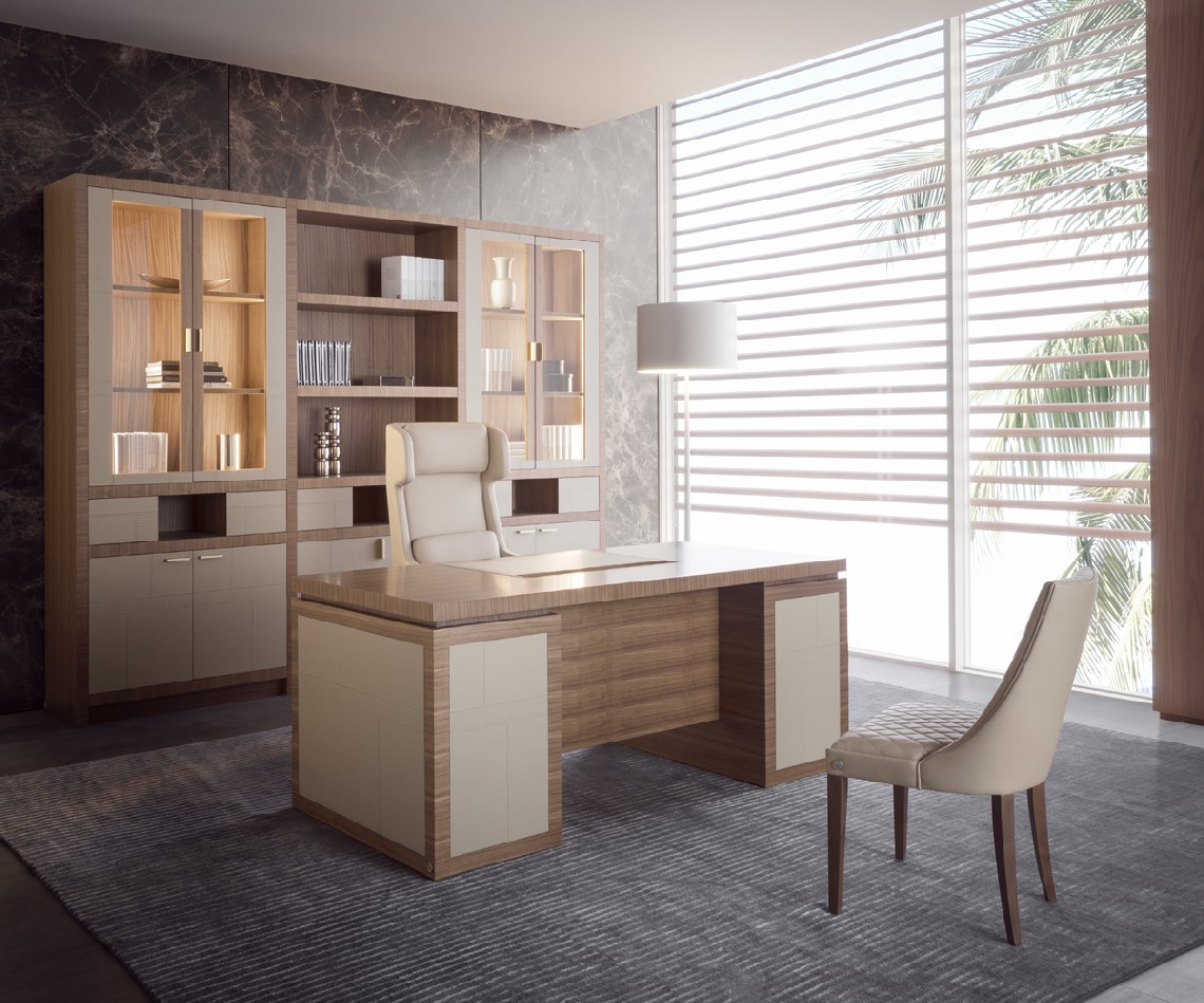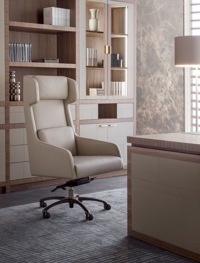 Poltrona girevole imbottita. Rivestimento in tessuto o pelle.