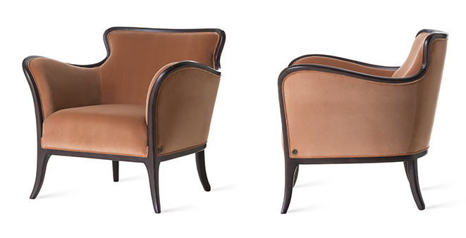 Poltroncina con struttura in legno e rivestimento in tessuto o pelle.