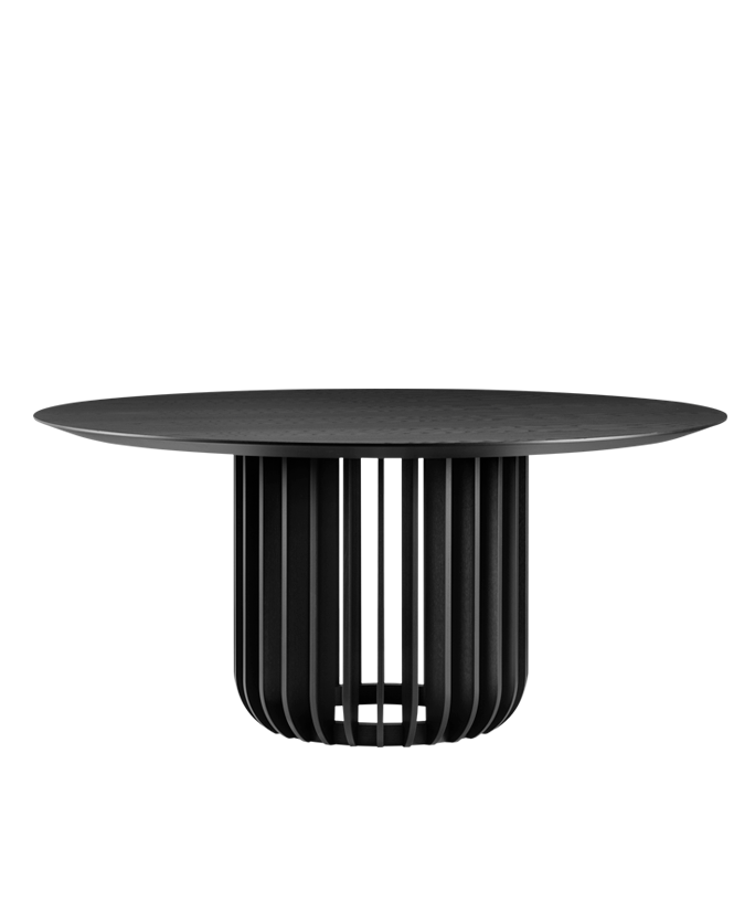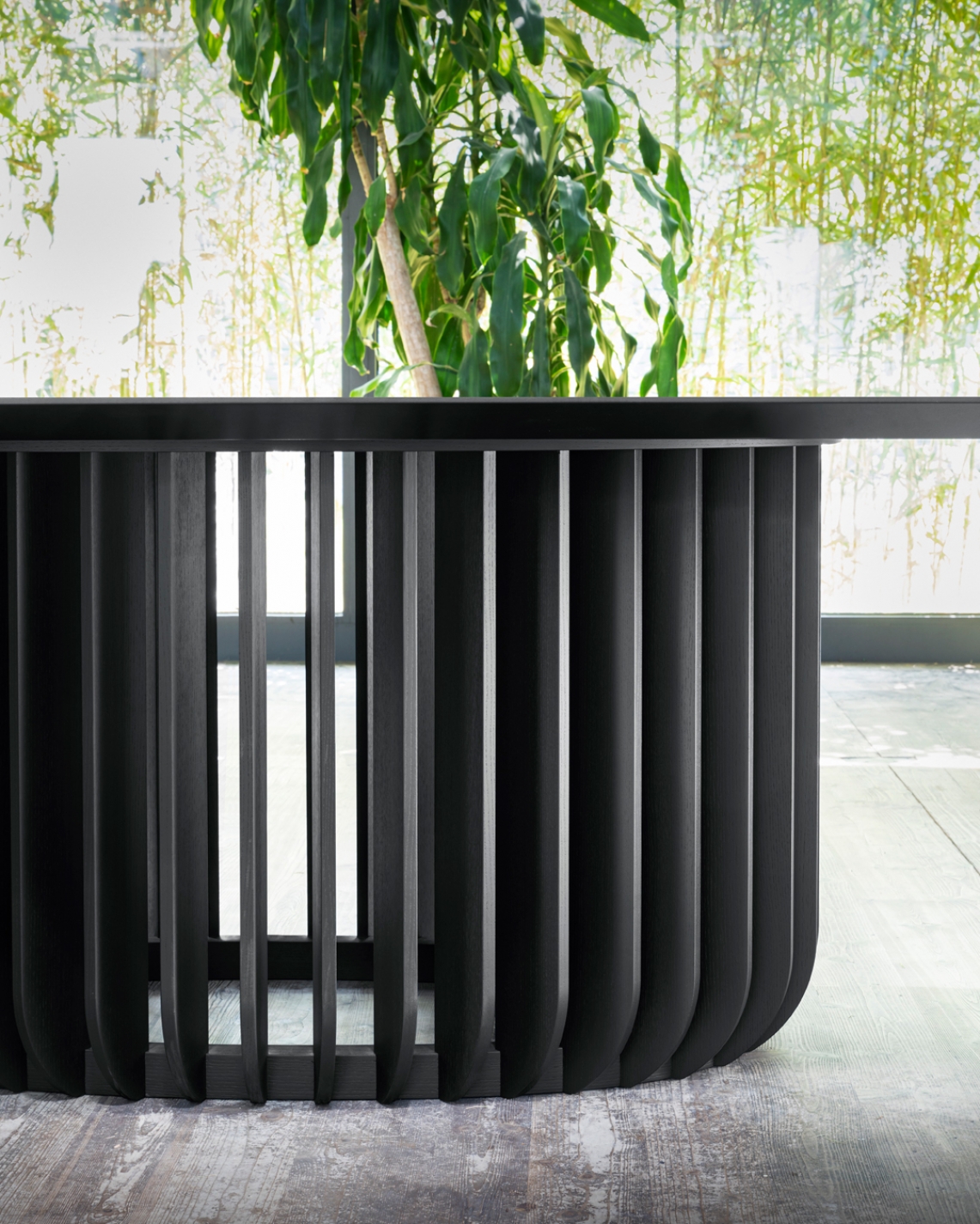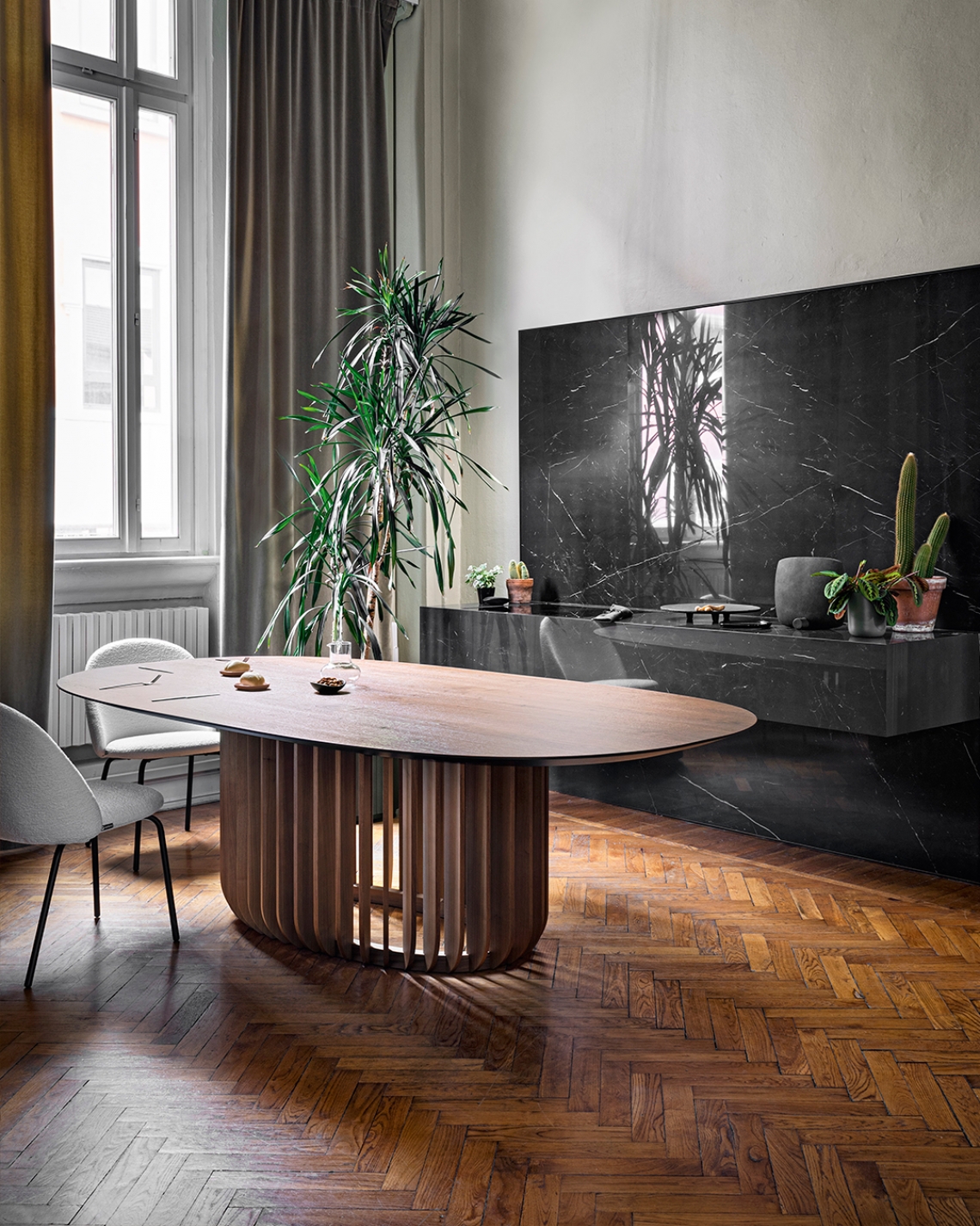 Juice is a monumental table with a meditative air. Its essence lies in the base, where the long wooden legs attach to a ring, encircling it. Juice, a table developed around the balance between filled and empty spaces, creates a sensation of perfect calmness.
