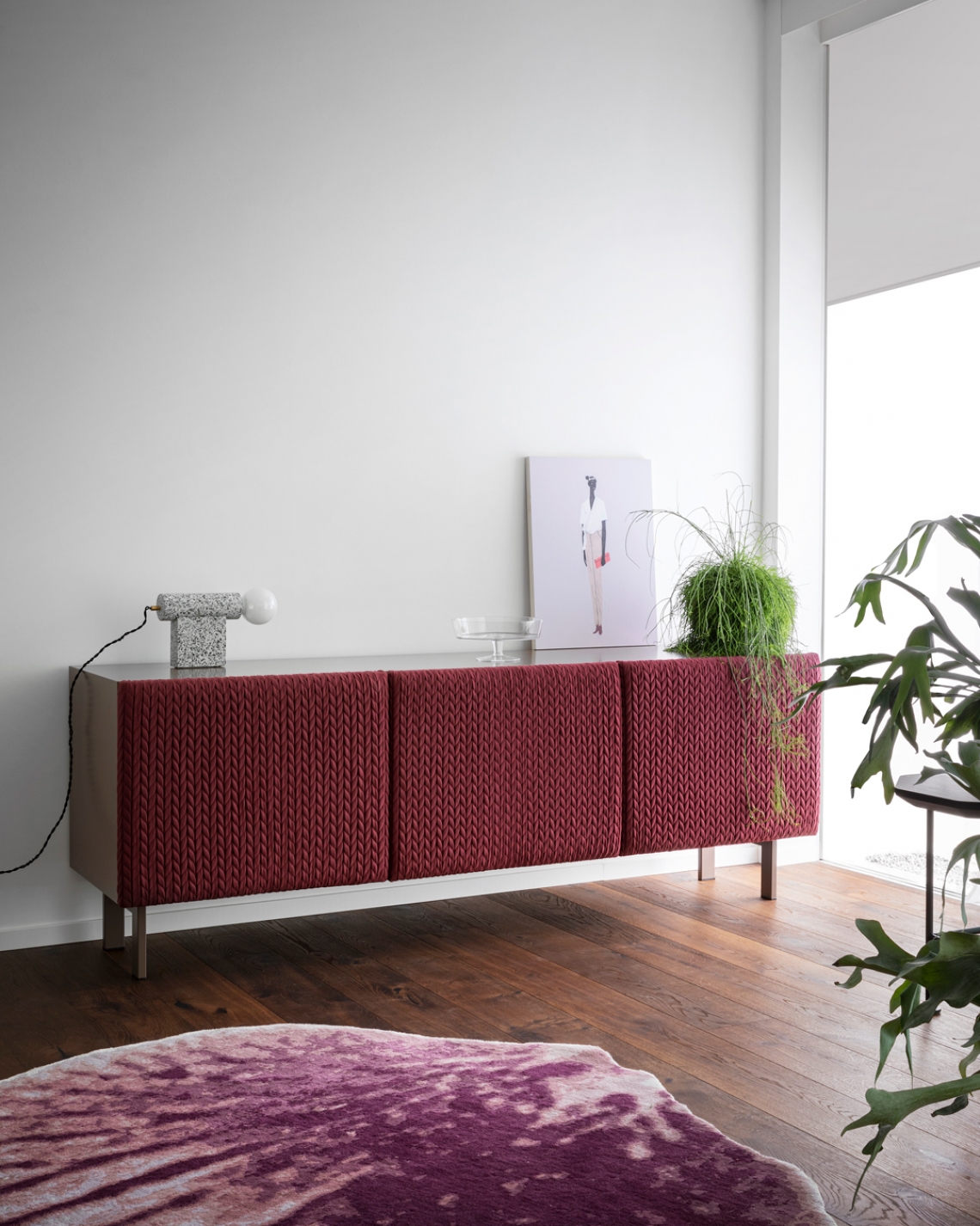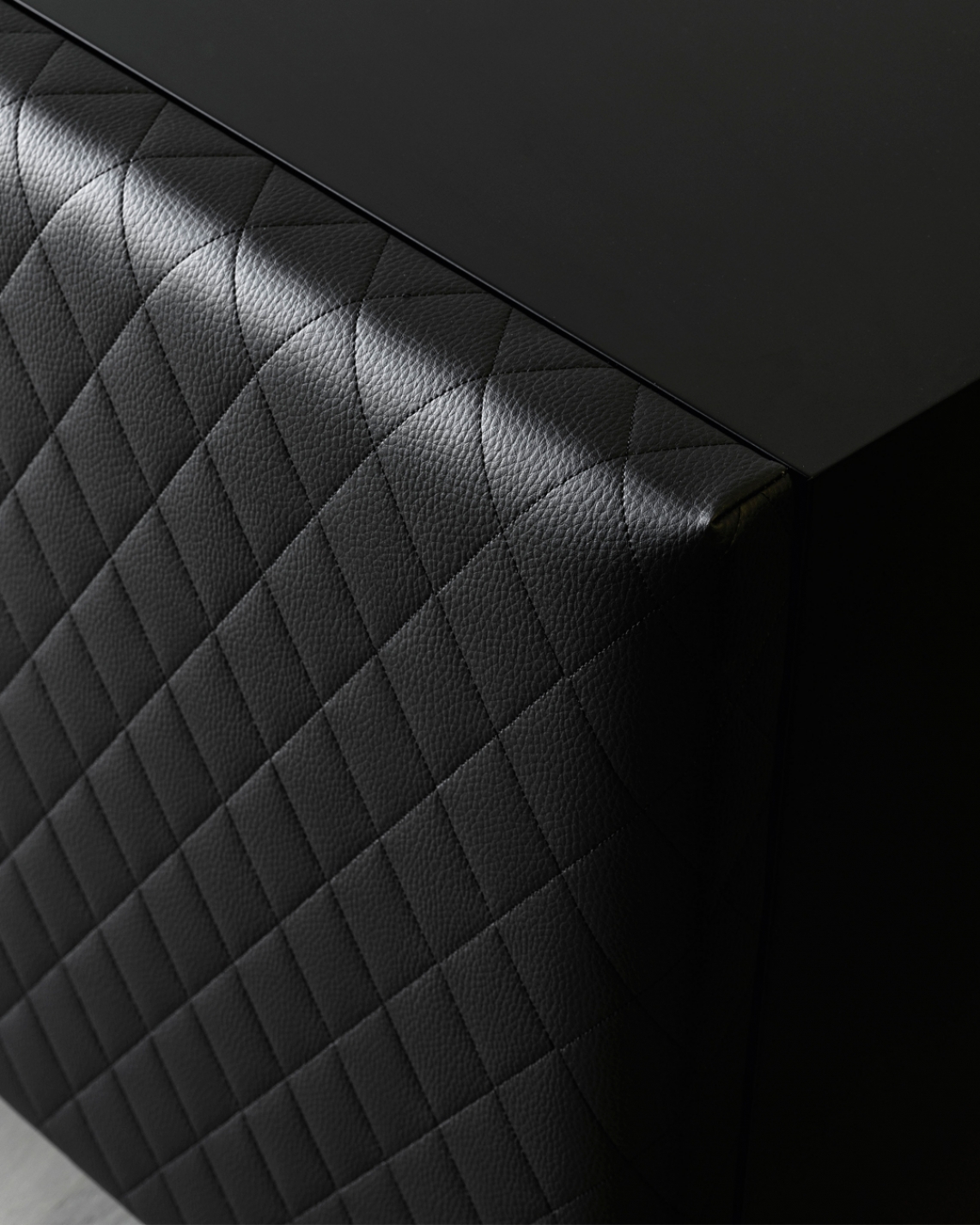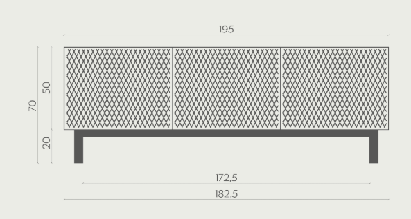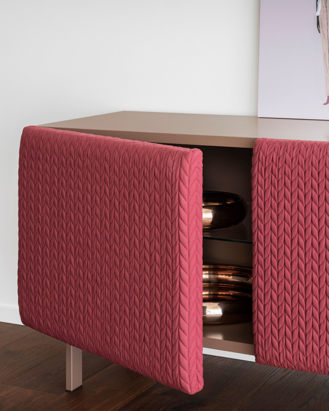 Elegant in name and shape, the sideboard is characterized by padded doors, with a precious diamond-patterned embroidery. It is a bourgeois element that brings attention to itself.
