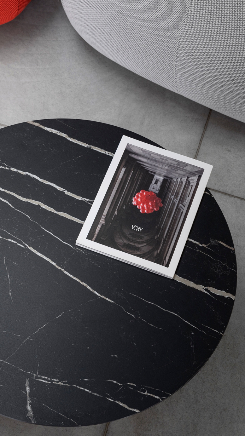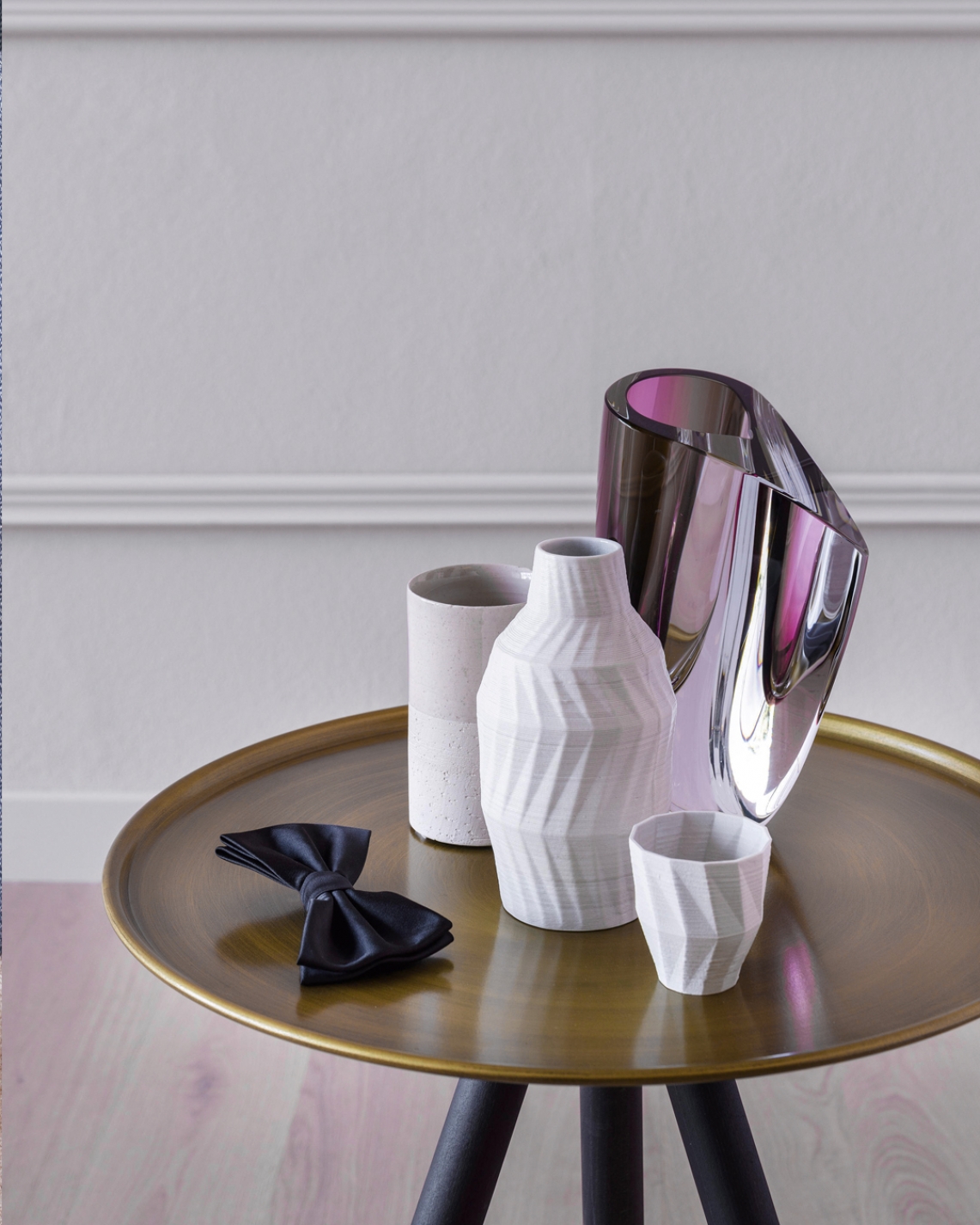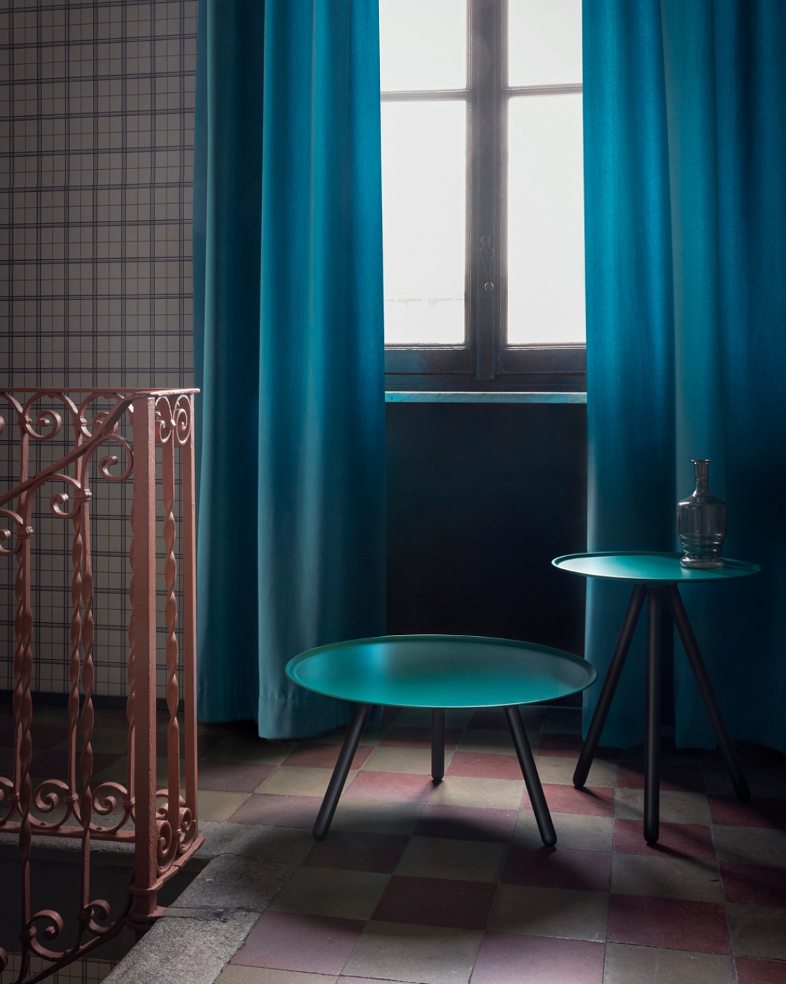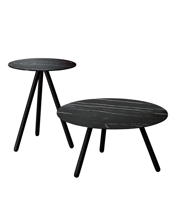 Supported by three turned wood legs, Pinocchio with a coloured top sports an eccentric air while it takes on a more discreet tone with the stoneware top.