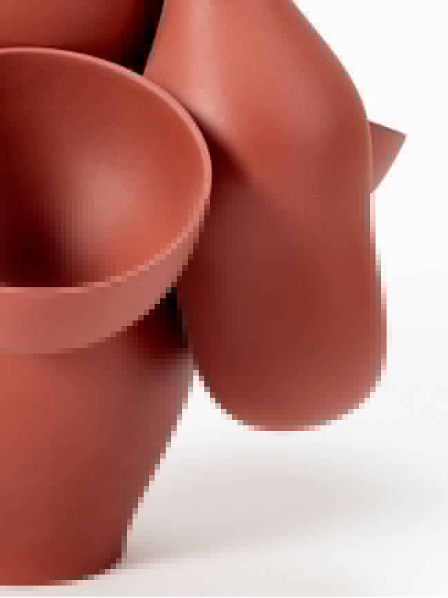 Allpa, Qucha and Pacha are based on the same concept. They each have an identical large central receptacle. The distinctiveness of each vase comes from the way the smaller receptacles are repeated and fit onto the main central one. The combinatory principle is common to the three vases. It is the way in which the smaller containers are positioned and fit into the hollow of the bigger central part which distinguishes each vase and creates its character.