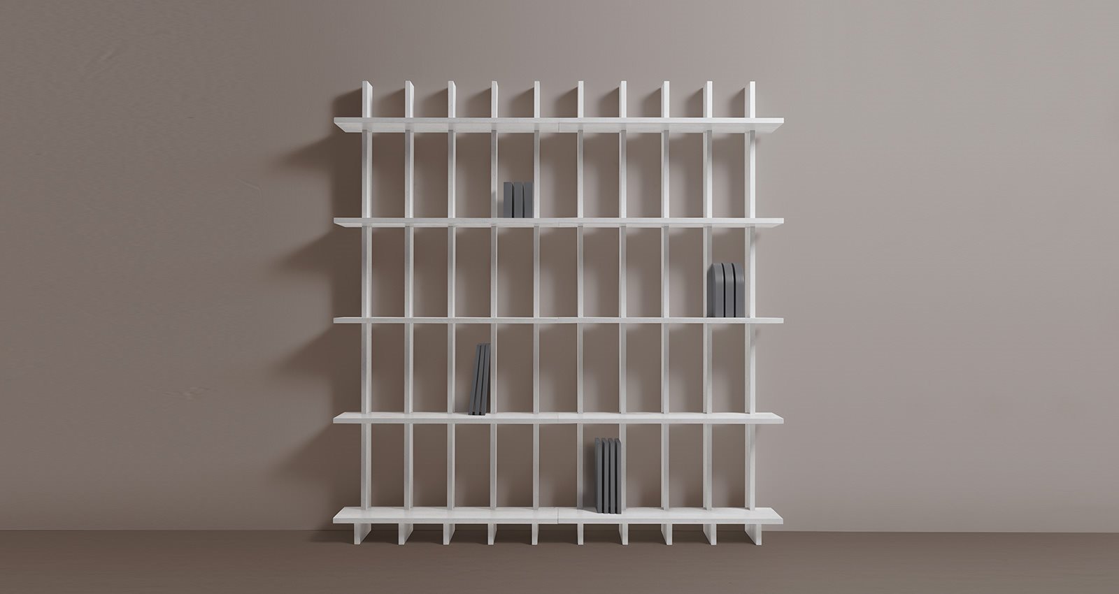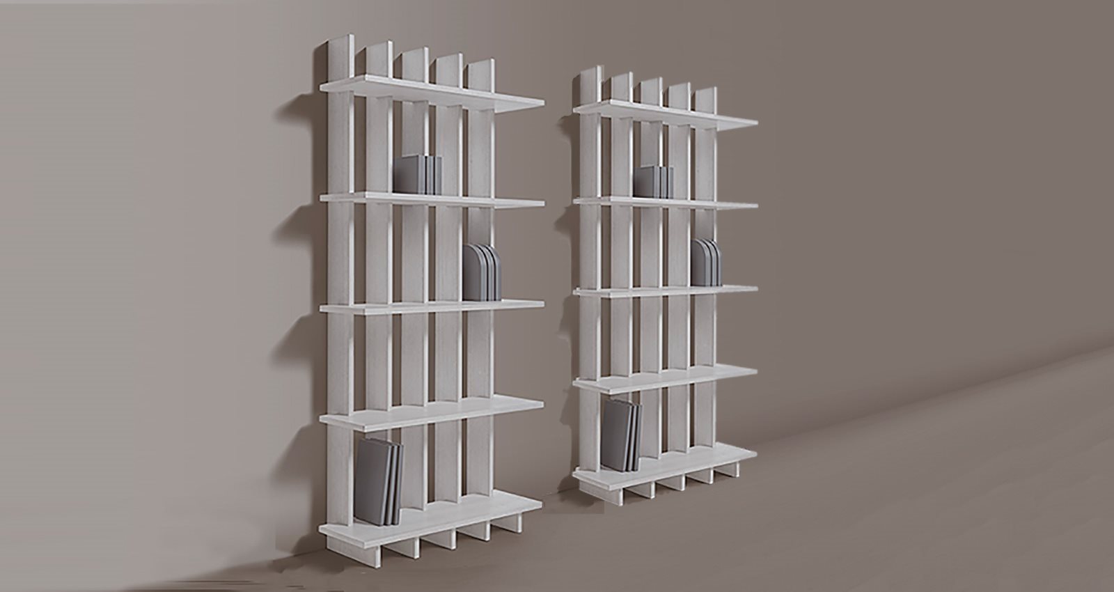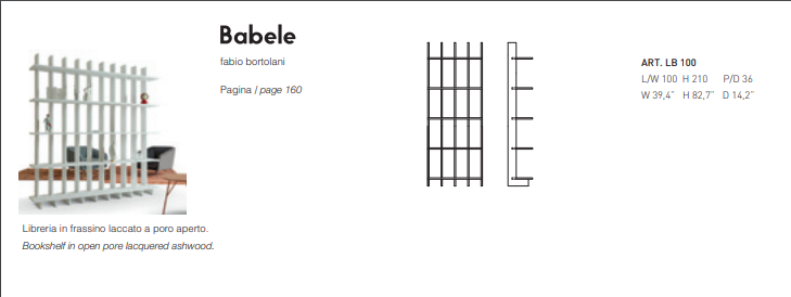 The idea is a cabinet with open, jutting-out shelves which can hold not only books, but also other objects, avoiding the typical “box effect”.