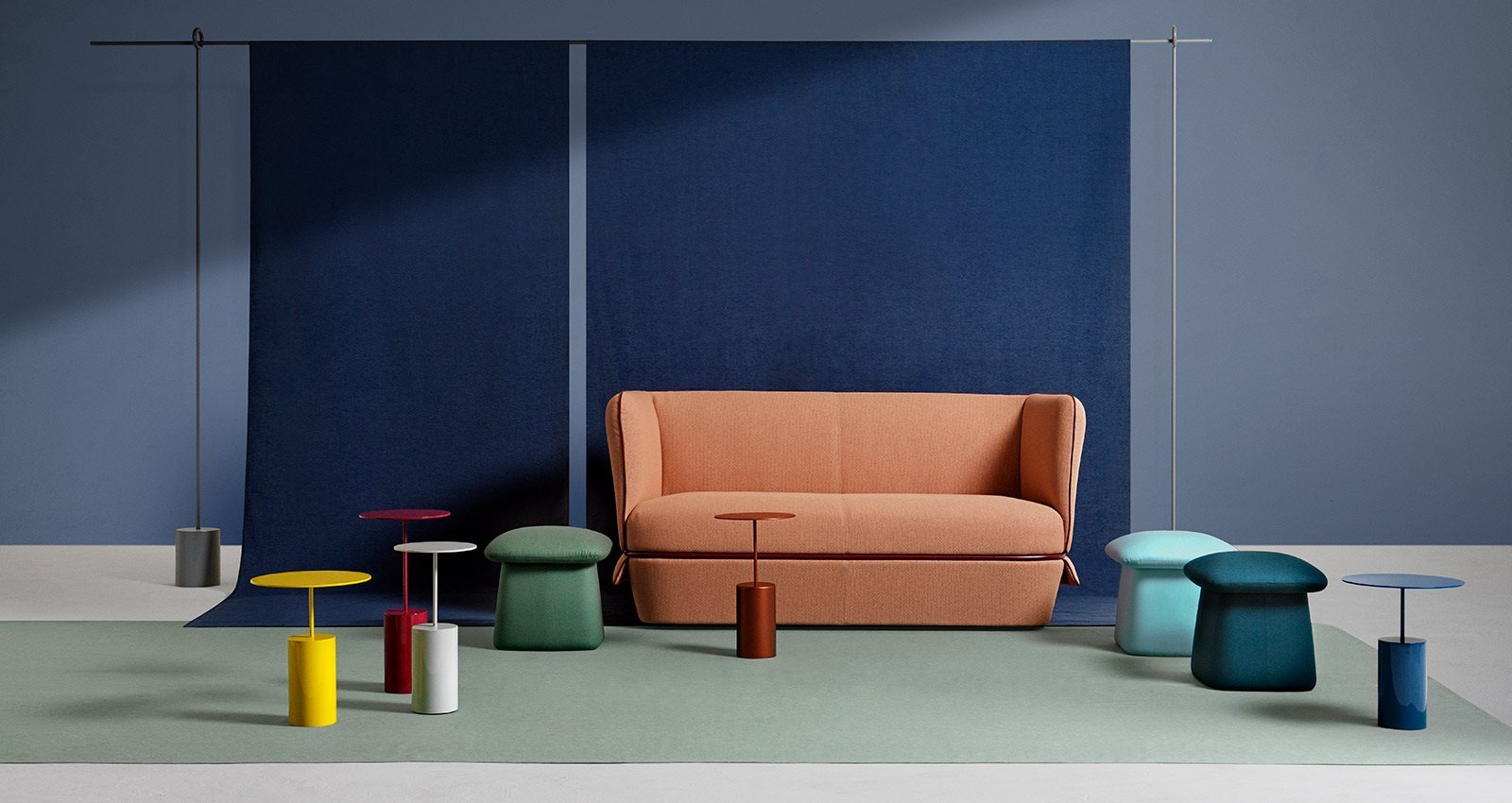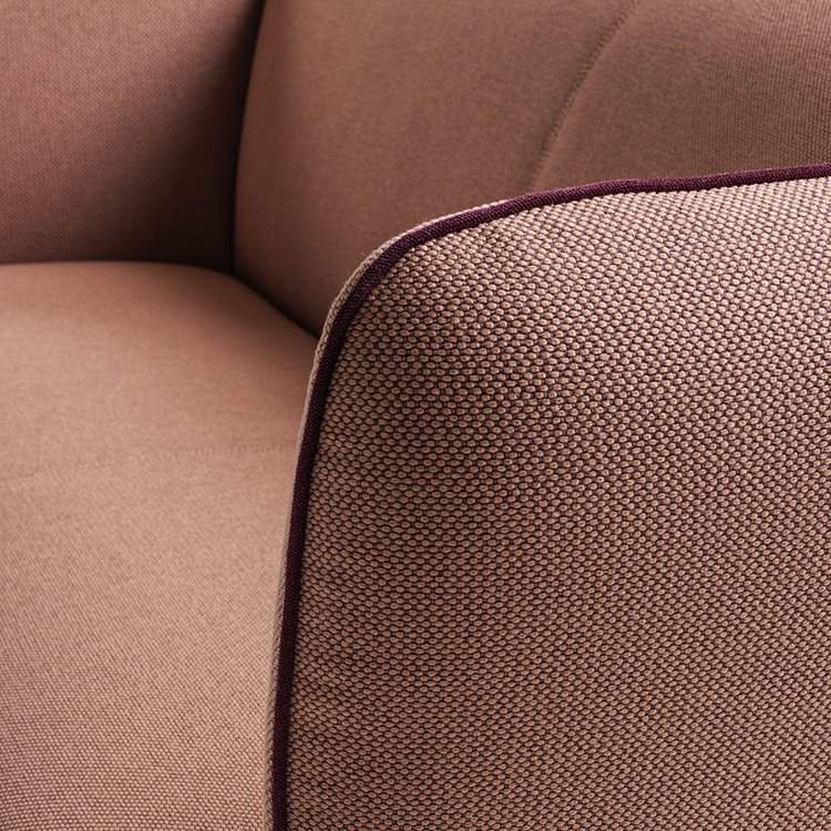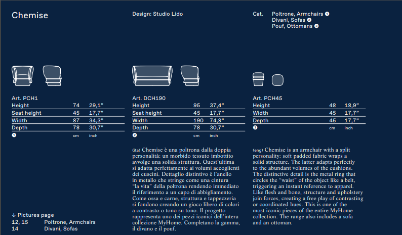 This two-seater sofa with its soft and enveloping design is devised to express sophisticated and contemporary comfort, thanks to the abundance of fabric that upholsters the frame and a tubular loop-belt that accentuates its generous shape. The sofa is completed by the new ottoman version of Chemise: an object boasting a multitude of functions, sometimes used as a seat, and others as a footrest.