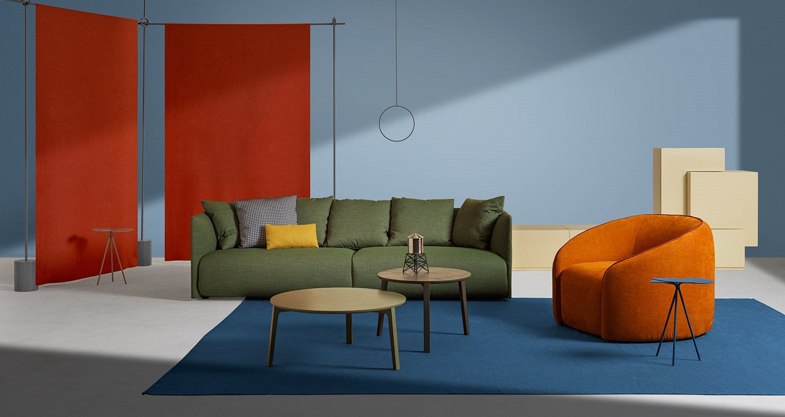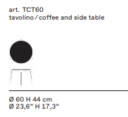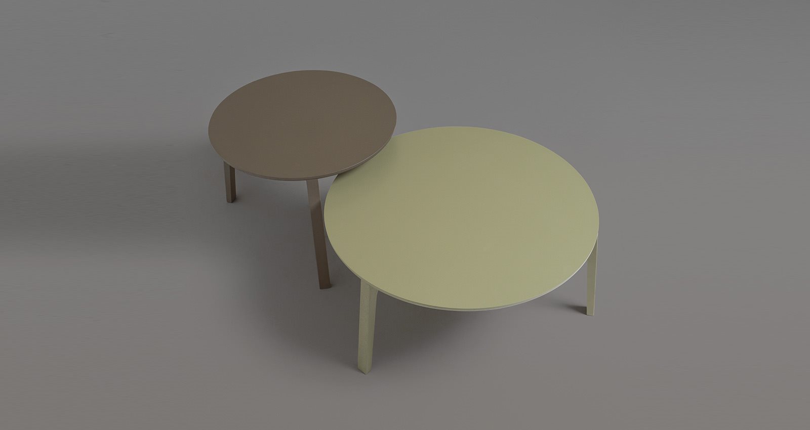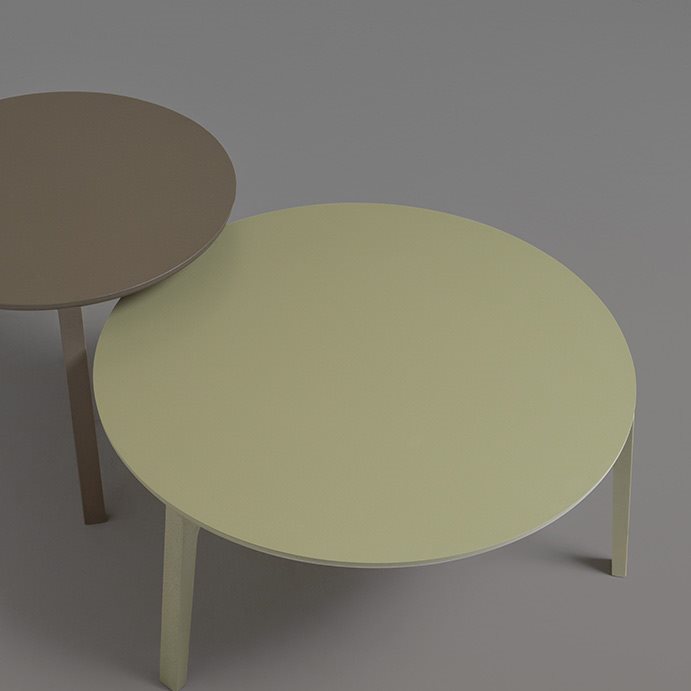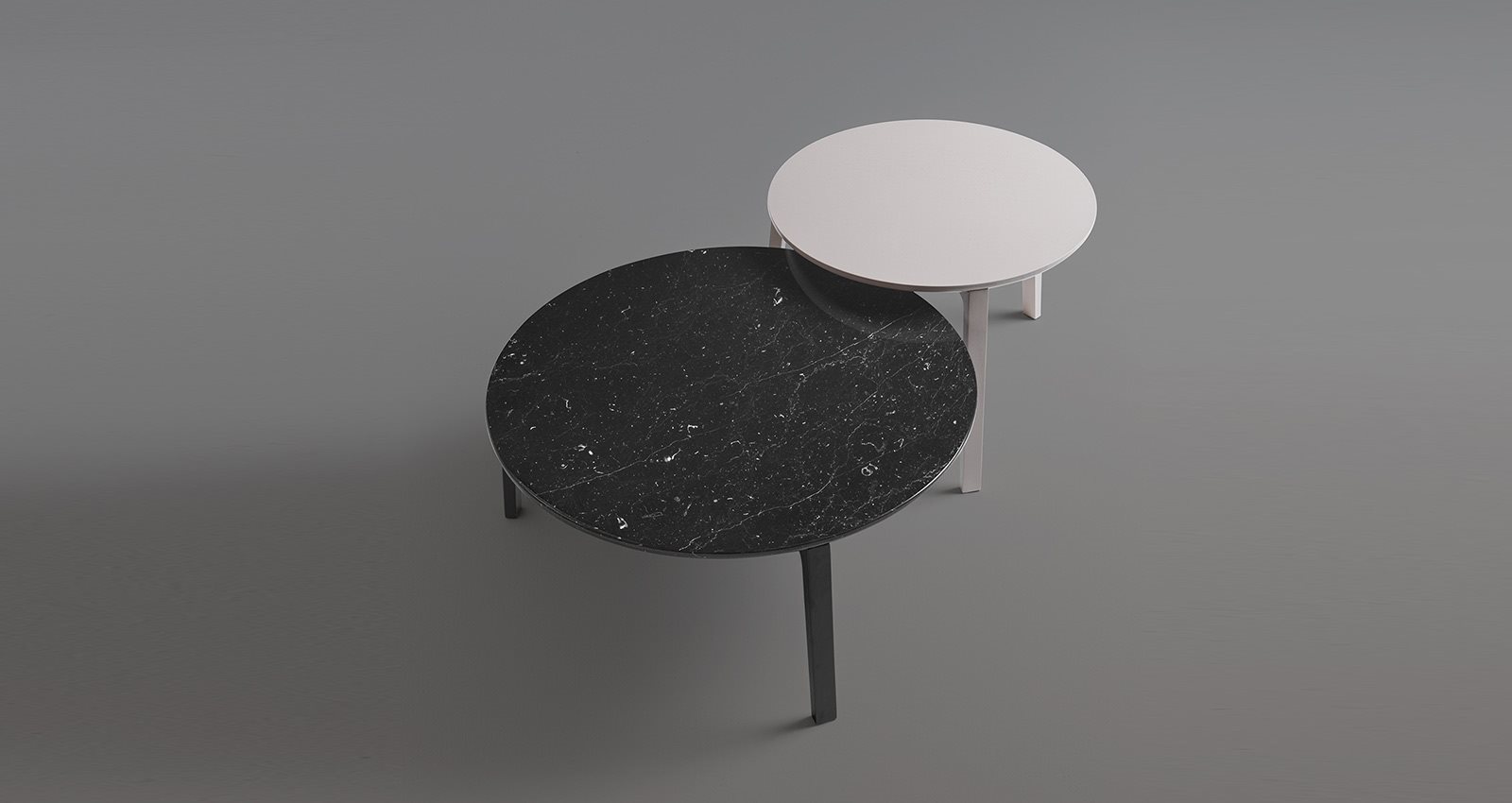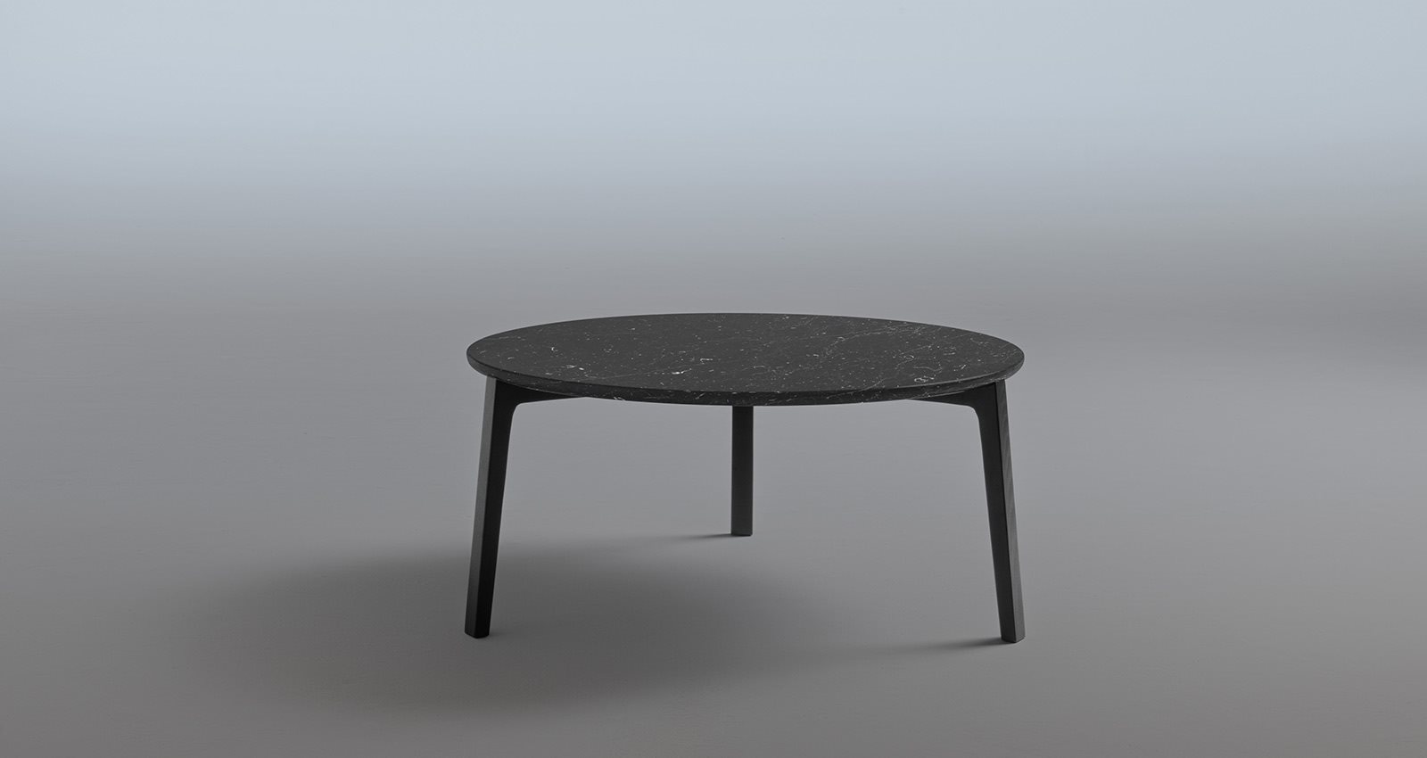 The Cot tables have been created to interact with the Riquadra seating collection, from which they inherit the cross–section of the leg and its relationship with the top. Envisioned in two sizes, 60 and 80 cm, they have tops in marble or wood. The circular tops, with rounded lower borders, are fitted to the particular cross–section of the legs in solid ash wood. The structure is enhanced and reinforced by the characteristic central three–way joint.