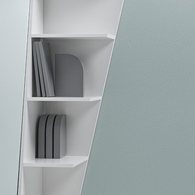 Corner bookshelf in lacquered wood.