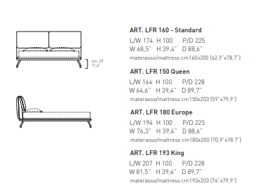 Bed. Wooden headboard and bed edge covered in polyurethane foam and polyester fiber lining. Headboard cushions in sterilized feather. Fabric cover, mono or two-coloured. Beechwood bed slats.