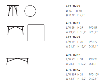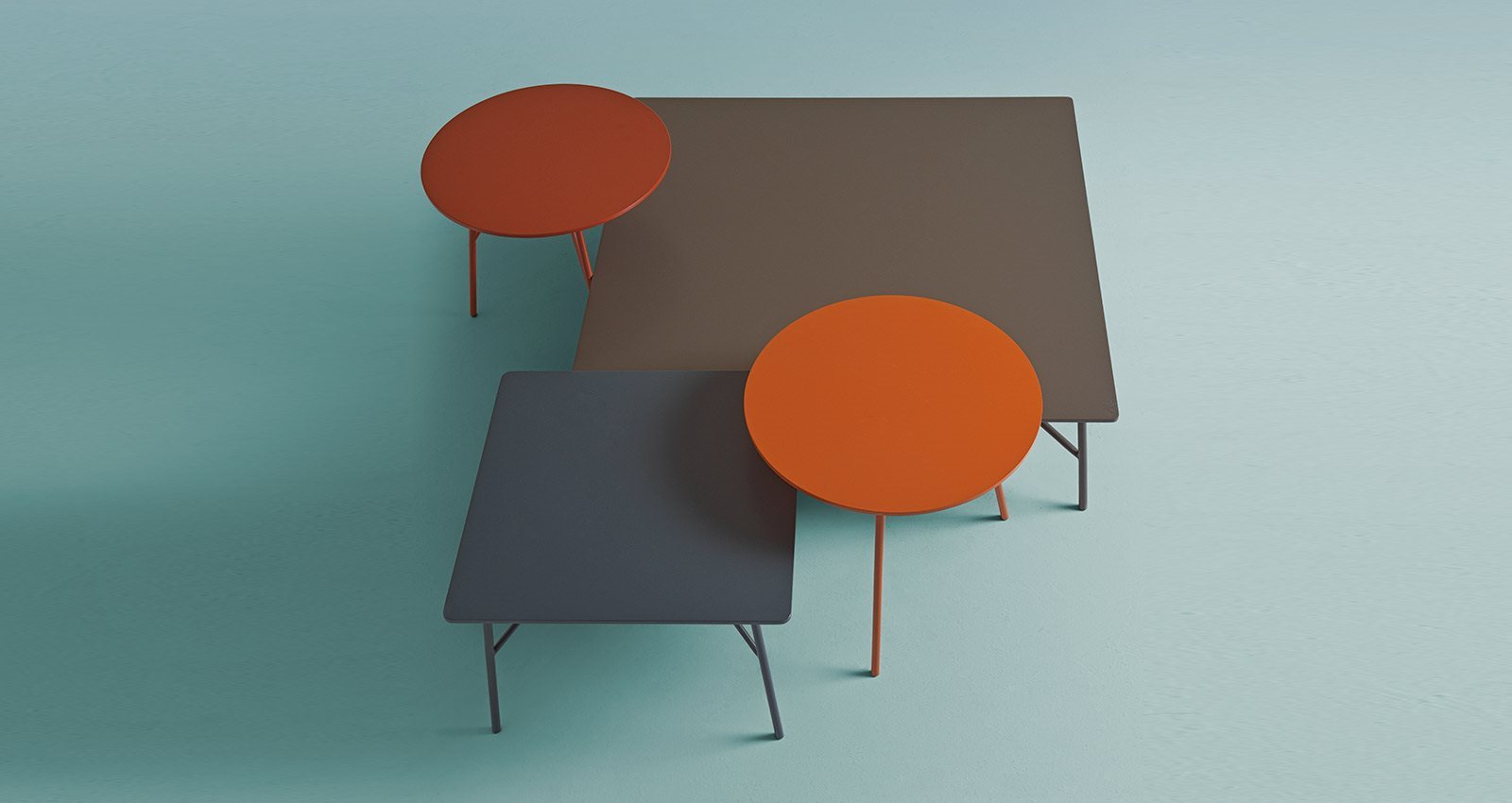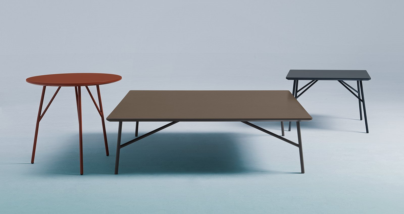 Coffee and side tables. Base in painted steel. Top in marble, heat-treated oak or lacquered wood.