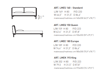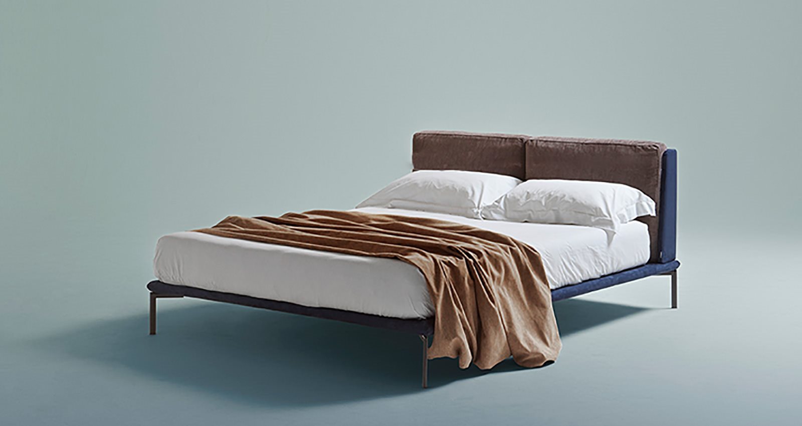 Bed. Wooden headboard and bed edge covered in polyurethane foam and polyester fiber lining. Headboard cushions in sterilized feather with insert in non-deformable polyurethane foam. Removable fabric cover. Beechwood bed slats. Legs in painted steel.