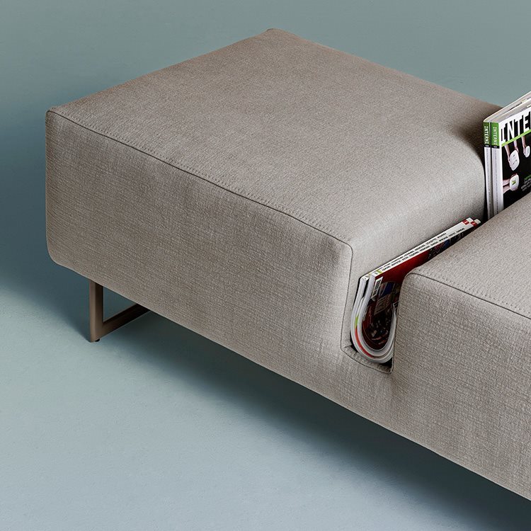 A padded two or three-seat bench with clean, essential lines. The housing for the (optional) cushion can also function as a place for magazines or objects. Ideal for residential and contract settings.