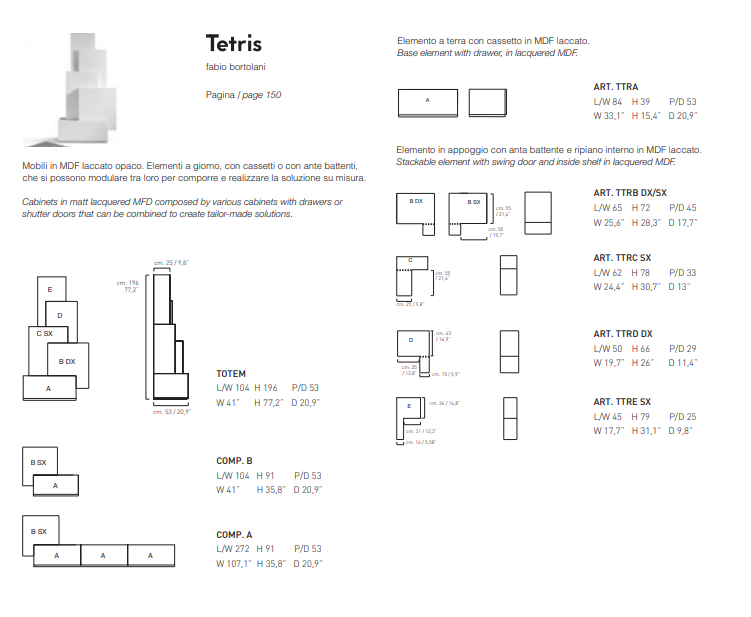 Nowadays’ home needs objects that are functional and in the same way visually sculptural and evocative,which add status to our living environment. TETRIS is a modular system that offer unusual and modern possibility of compositions, combining floor and handing elements.